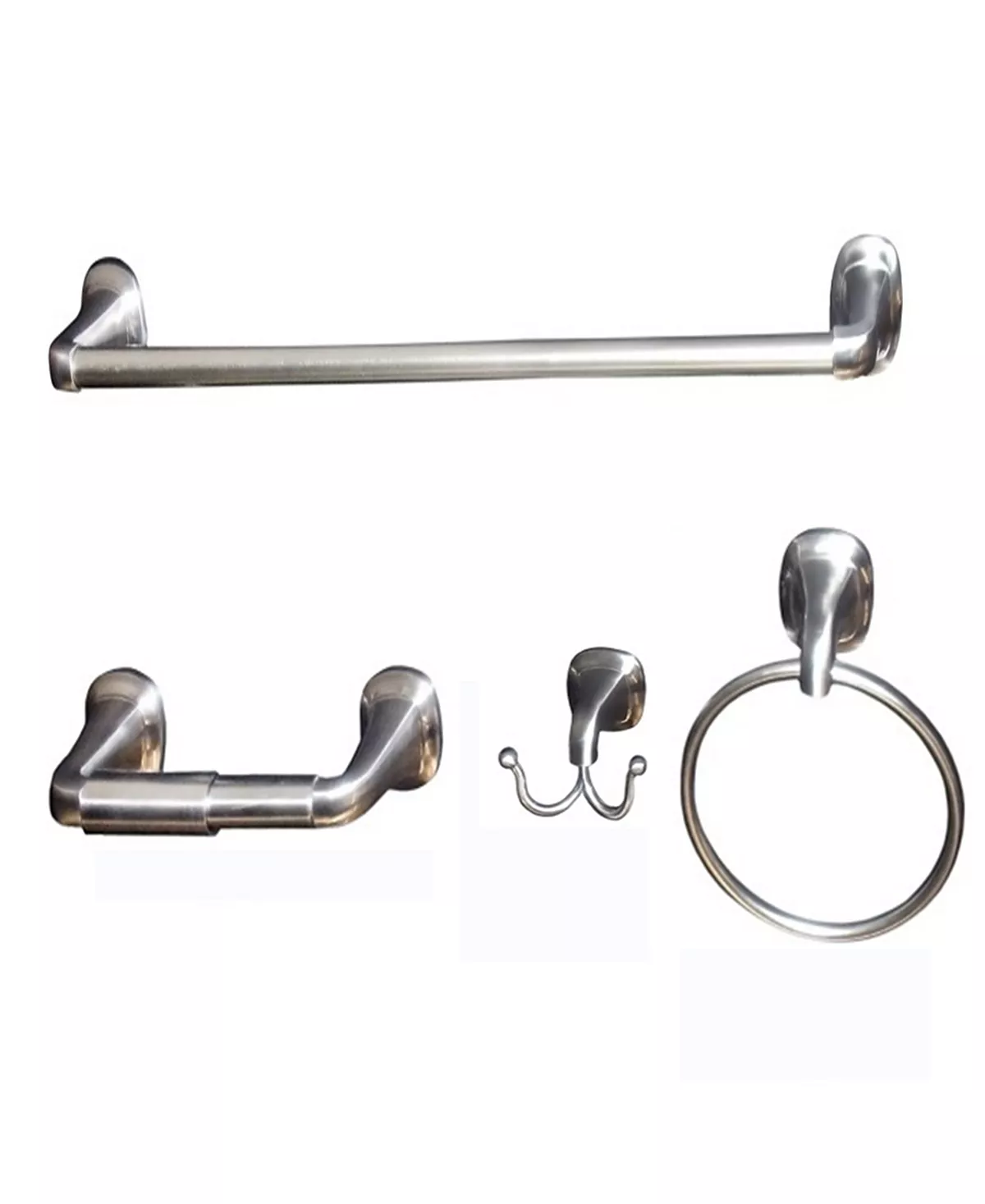 - Set includes: 24″ towel bar, toilet paper holder, towel ring and robe hook