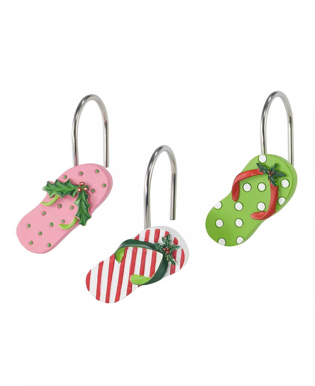 The Avanti flamingo jingle shower curtain hook set features 3 festively decorated flip flops in shades of red and green with holiday accents. Made of durable hand painted resin for long life and easy care.