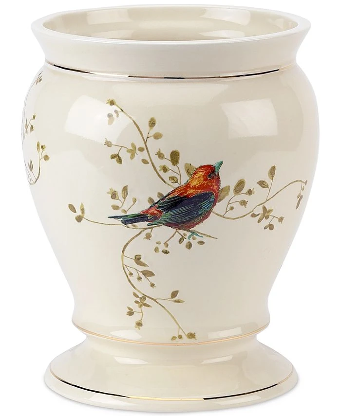 Featuring gold accents and raised-decal birds on smooth ceramic, the Gilded Birds trash can accents your space with an air of elegance perfect in any season.