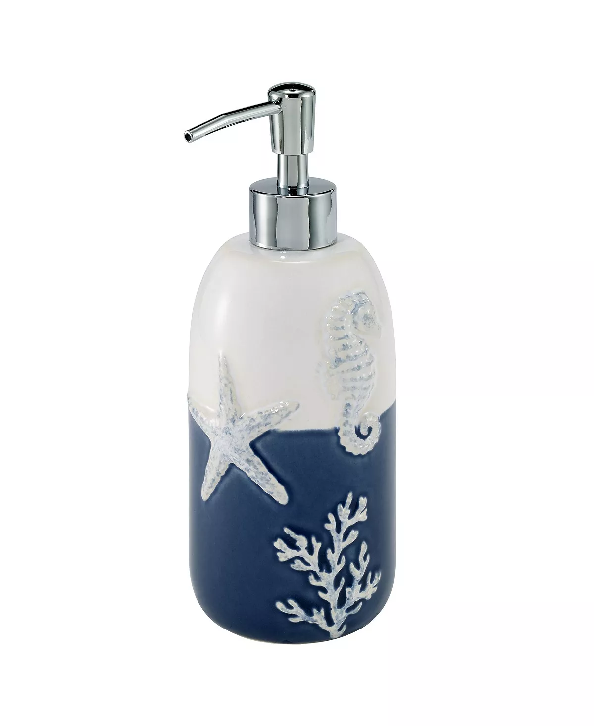 The Avanti Batik Coastal Lotion, Soap, Sanitizer Dispenser features a two-tone white and blue glaze for a hand-painted, every-piece-is-unique look. Decorated with debossed starfish, seahorse and coral. Coordinating shower curtain, towels and accessories available.