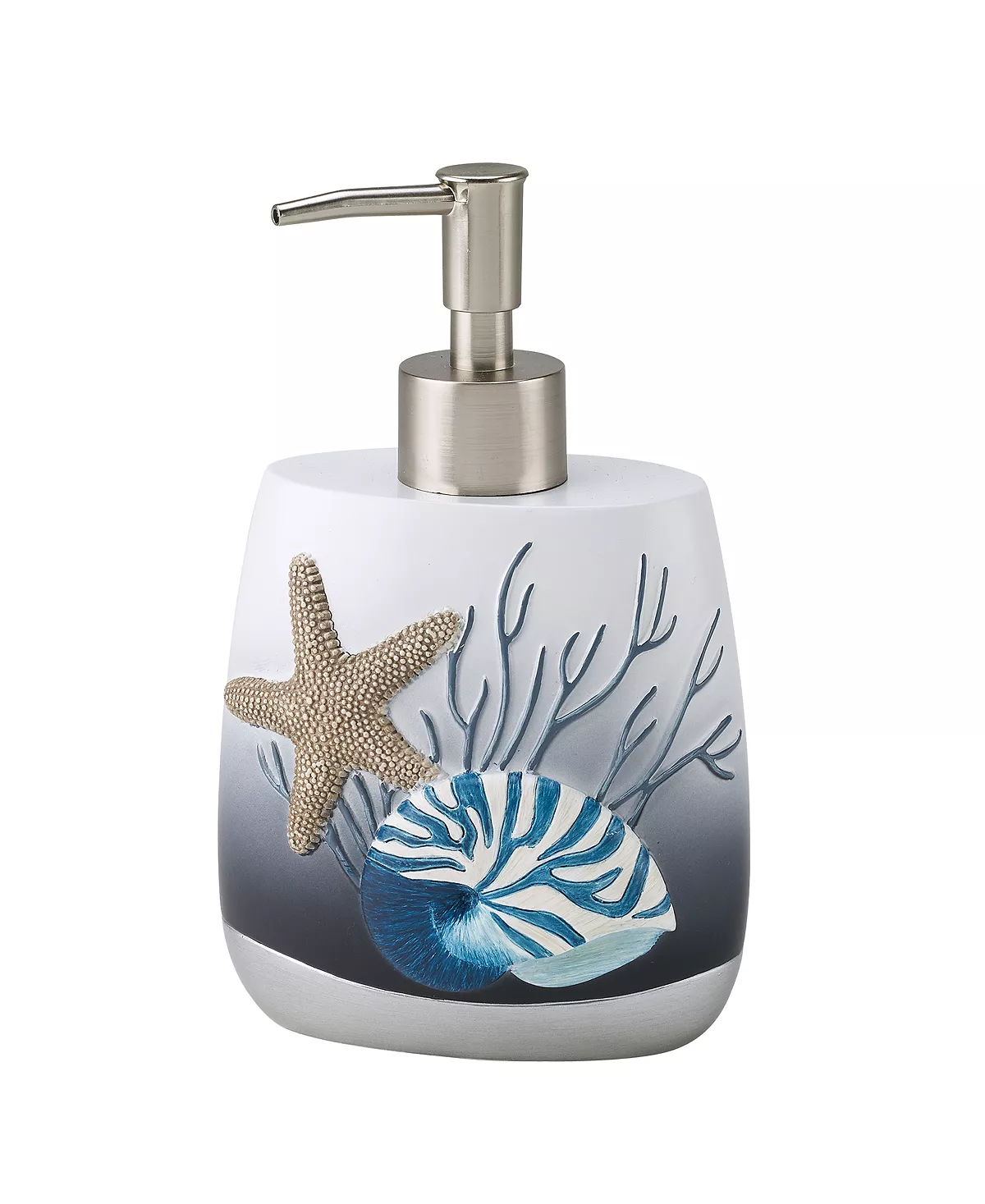 The Avanti Blue Lagoon Lotion Dispenser is decorated with raised starfish, shells coral in shades of blue beige on an ombre base that goes from off-white to dark blue. A contrasting silver border adorns the bottom.