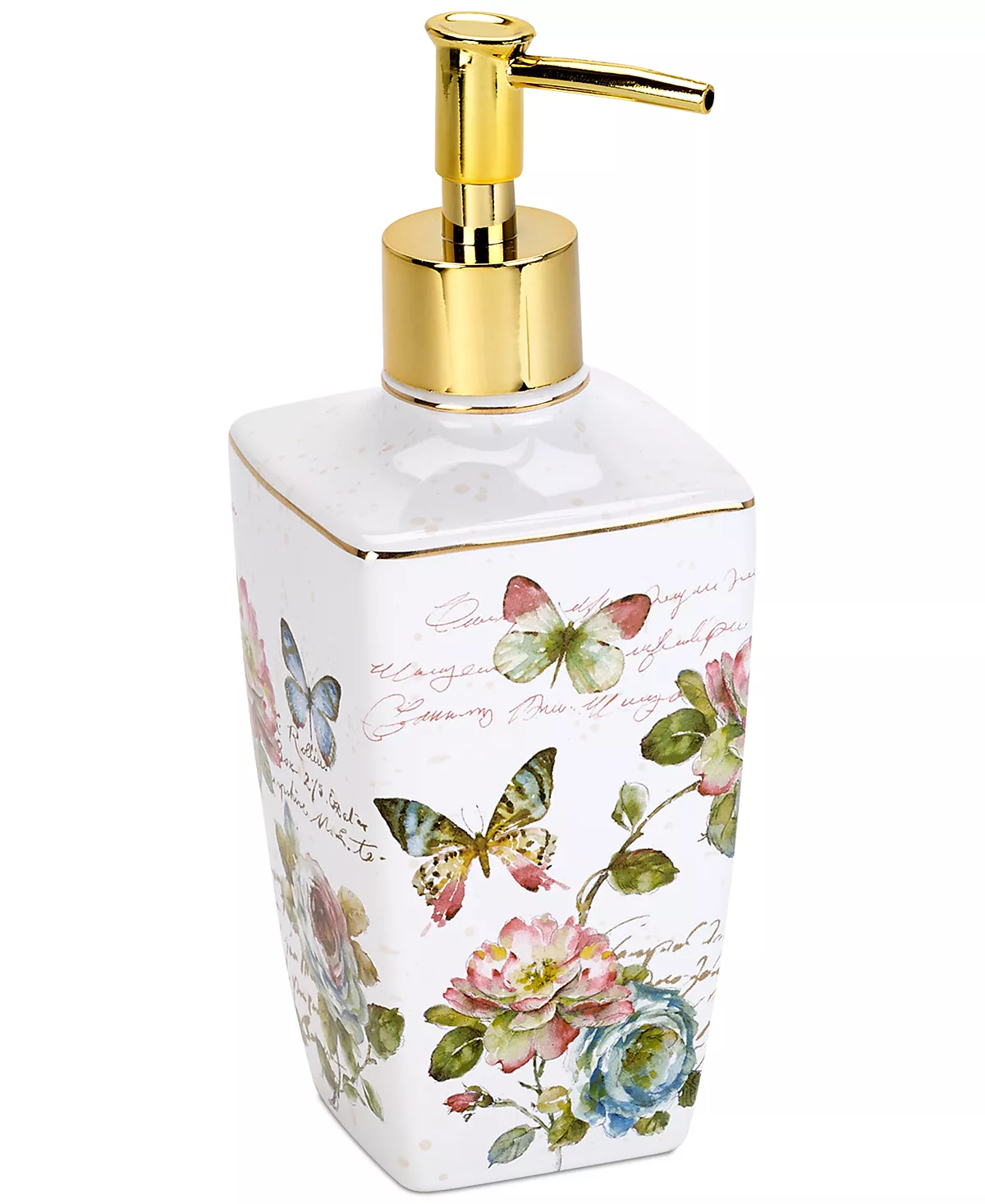 Elevate your bath with the lovely and inviting Butterfly Garden lotion pump from Avanti. This ceramic piece has a delicate floral motif accented by flitting butterflies, handwritten details, and gold trim complemented by a gold-tone dispenser.