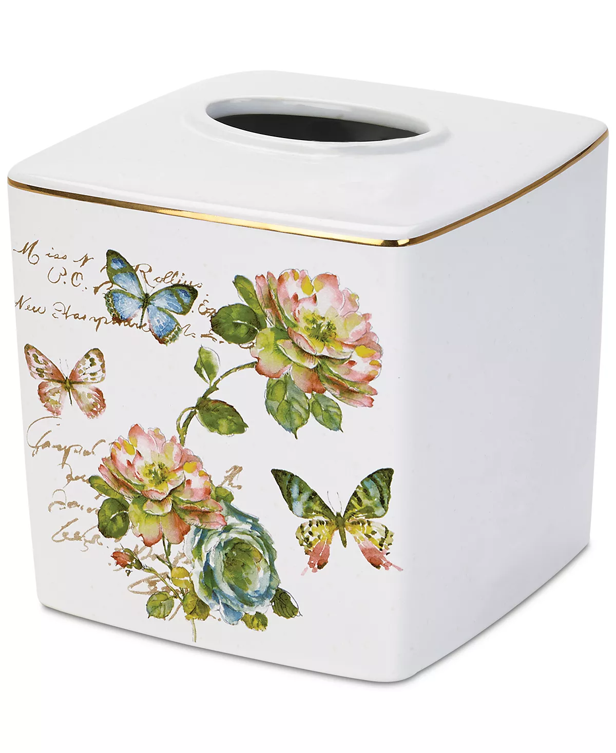 Elevate your bath with the lovely and inviting White Butterfly Garden tissue cover from Avanti. This ceramic piece has a delicate floral motif accented by flitting butterflies, handwritten details, and gold trim that adds an elegant touch.