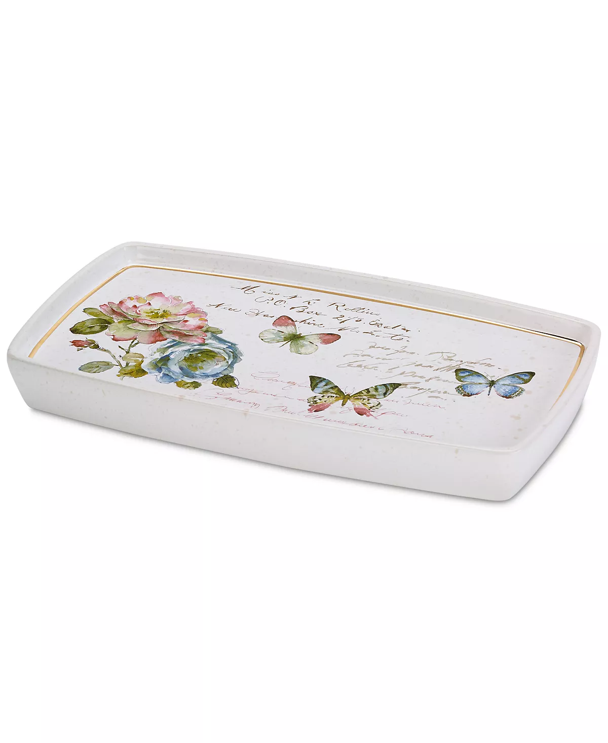 Elevate your bath with the lovely and inviting Butterfly Garden tray from Avanti. This ceramic piece has a delicate floral motif accented by flitting butterflies, handwritten details, and gold trim, offering an elegant spot to store accessories.