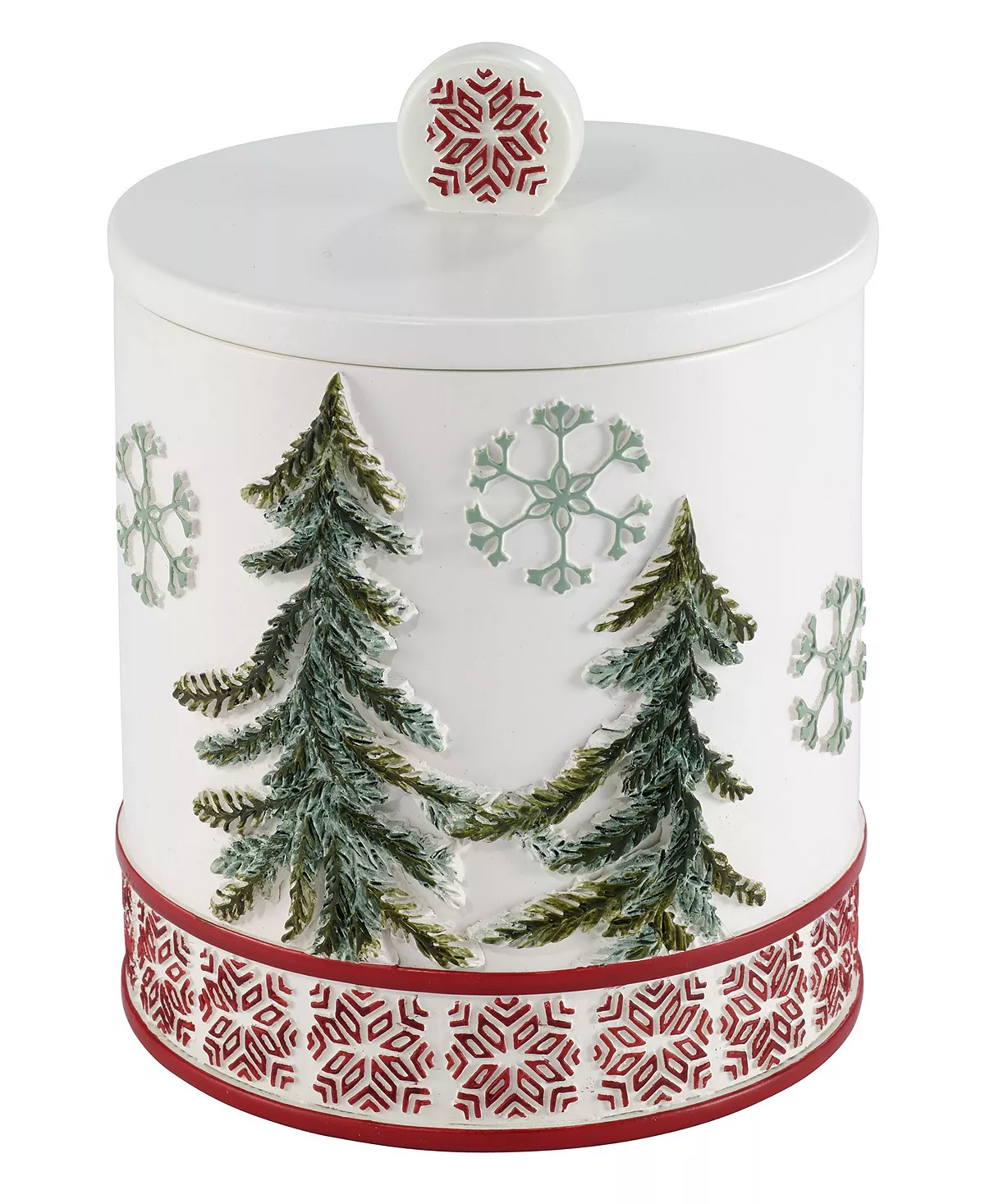 The Avanti Christmas Gnomes Covered Jar features 2 evergreen trees in relief on a white ground with gray snowflakes. The bottom is bordered with a red and white snowflake motif.