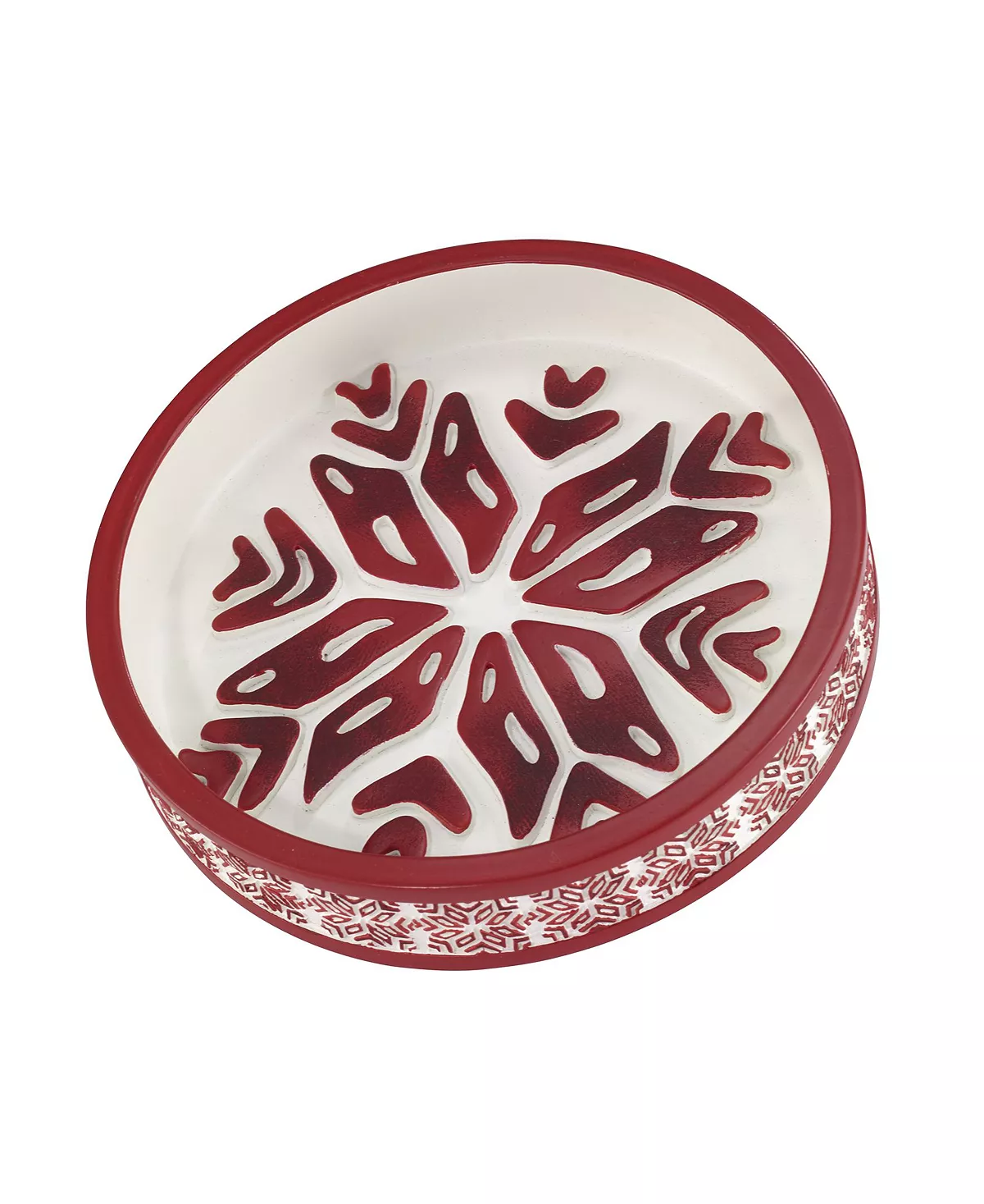 The Avanti Christmas Gnomes Soap Dish features a large red snowflake in relief on a white ground with its base bordered with a red and white snowflake motif.