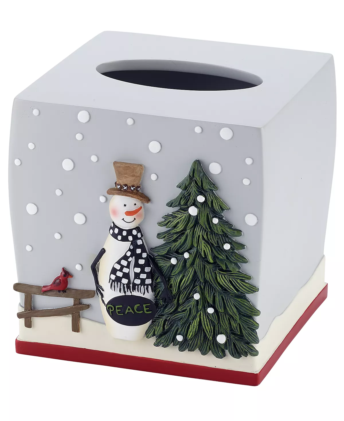 The Avanti Country Friends Tissue Cover is decorated with a friendly snowman with a black and white check scarf holding a “peace” sign with a snowy pine tree and cardinal perched on a fence. The bottom is trimmed with a coordinating red stripe.