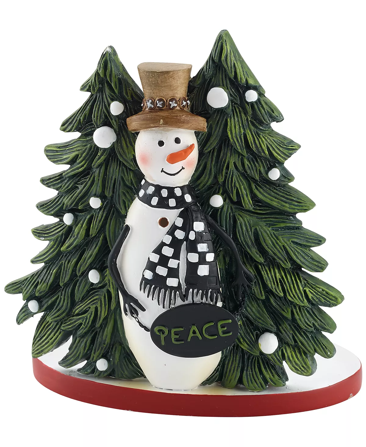 The Avanti Country Friends Toothbrush Holder is decorated with a friendly snowman with a black and white checked scarf holding a “peace” sign and surrounded by two snowy pine trees. The bottom is trimmed with a coordinating red stripe.