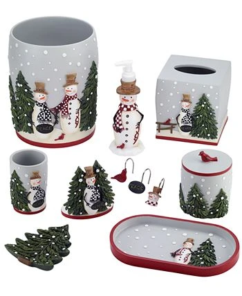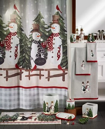 The Avanti Country Friends Tumbler is decorated with a friendly snowman with a black and white checked scarf holding a “peace” sign with a snowy pine tree on a grey ground. The bottom is trimmed with a coordinating red stripe.