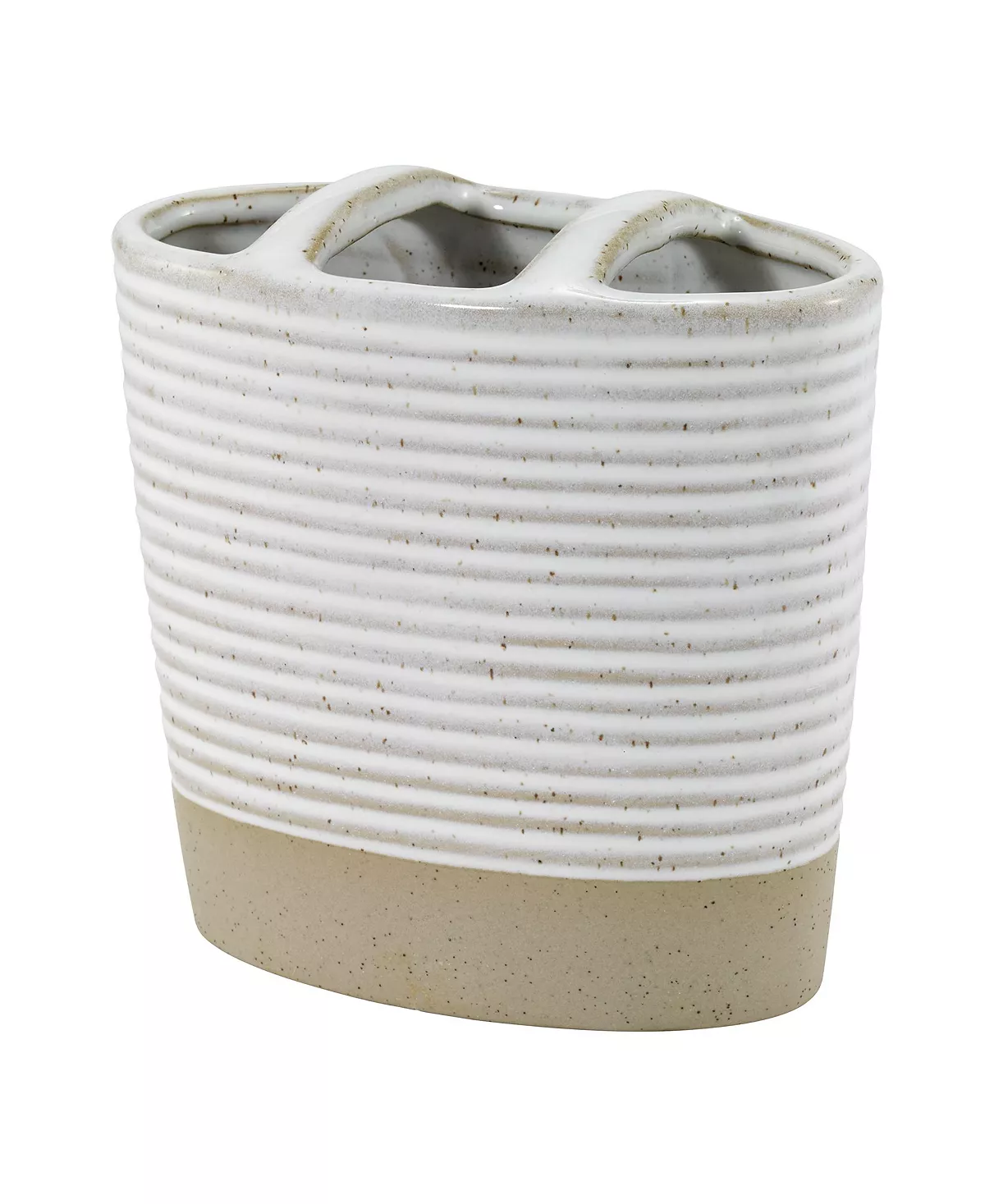 The Avanti Drift Toothbrush Holder features a textured ribbed look with alternating glossy white and linen lines on the body with a solid linen textured matte base. Made out of sand clay with white glaze. Full coordinating bath accessory collection is available.
