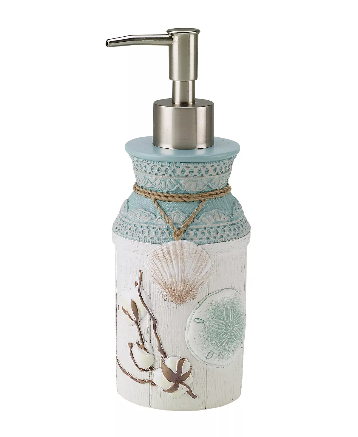 The Avanti Farmhouse Shell Lotion Dispenser features a sand dollar, cotton on the vine with a fan shell medallion hanging on a rope from the neck. The background is textured, off-white shiplap with blue lace border on top.