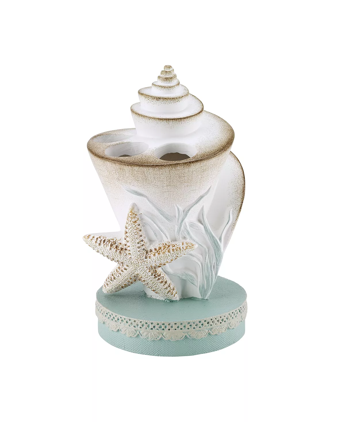 The Avanti Farmhouse Shell Toothbrush Holder is a figural conch shell in shades of beige with a starfish attached to its base and blue coral. The base is light blue with blue and ivory lace.