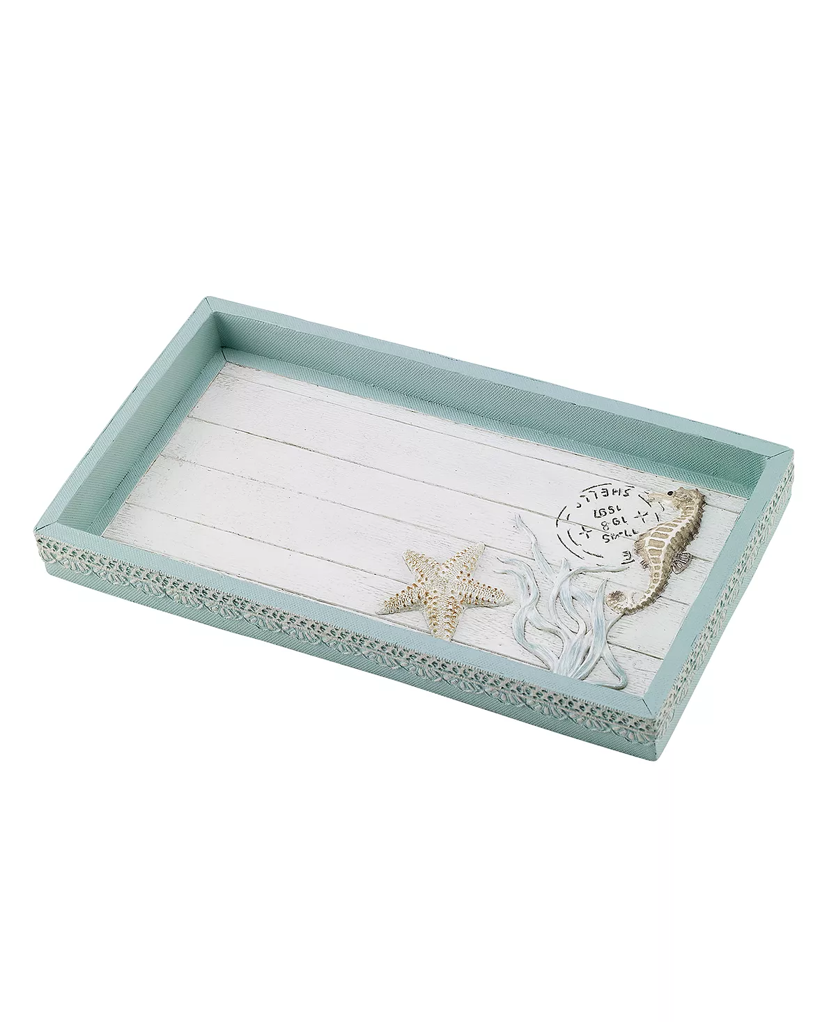 The Avanti Farmhouse Shell Tray features a seahorse, starfish, postmark and coral in light blue beige on a textured, off-white shiplap background with a coordinating blue lace border on the side.