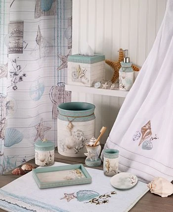 The Avanti Farmhouse Shell Tumbler features a seahorse, starfish and coral in light blue and beige on a textured, off-white shiplap background with a coordinating blue lace border on top.