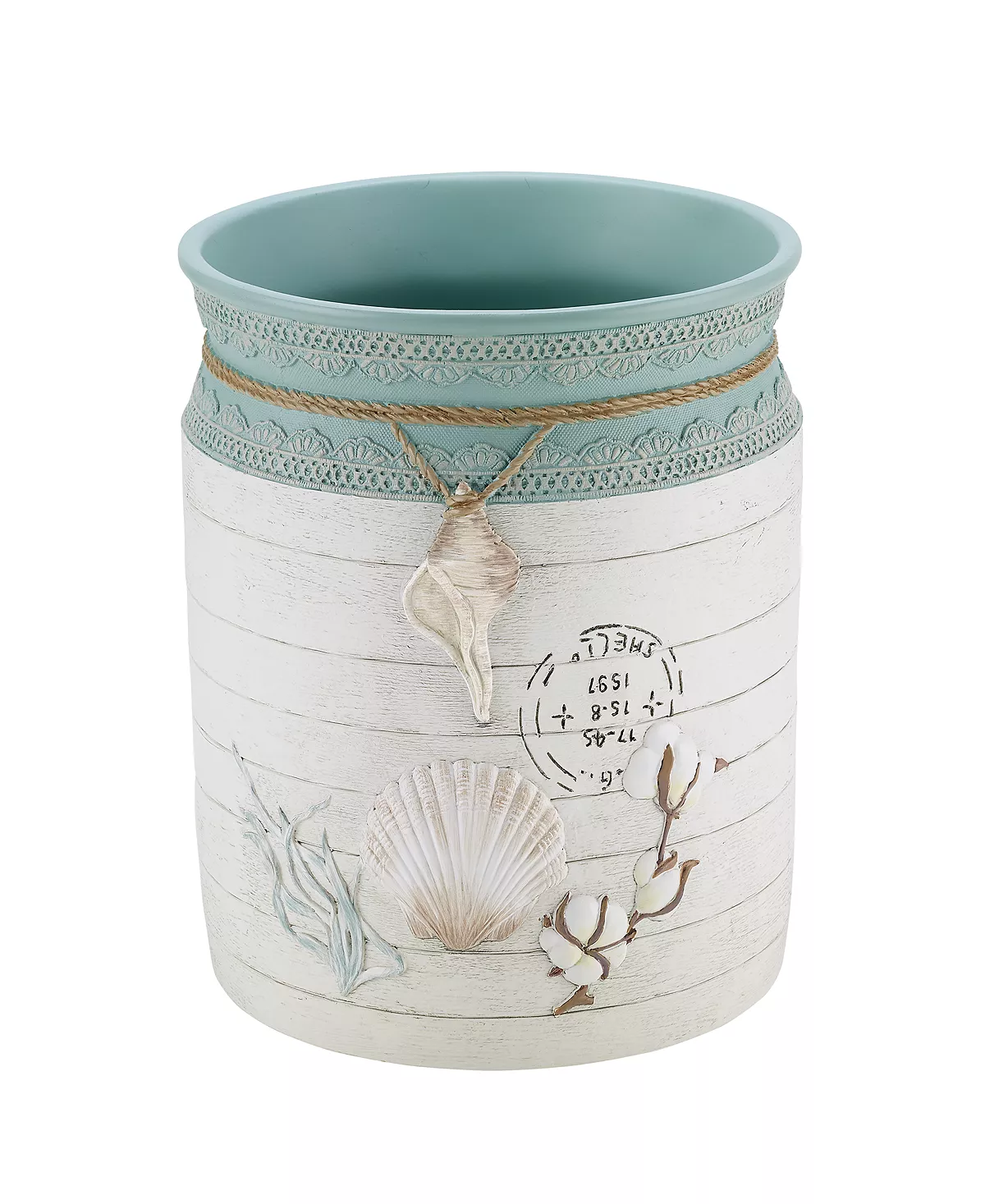The Avanti Farmhouse Shell Wastebasket features a fan shell, coral cotton on the vine with a shell medallion hanging on a rope from the rim in light blue beige. Textured background, off-white shiplap, a blue lace border on top.
