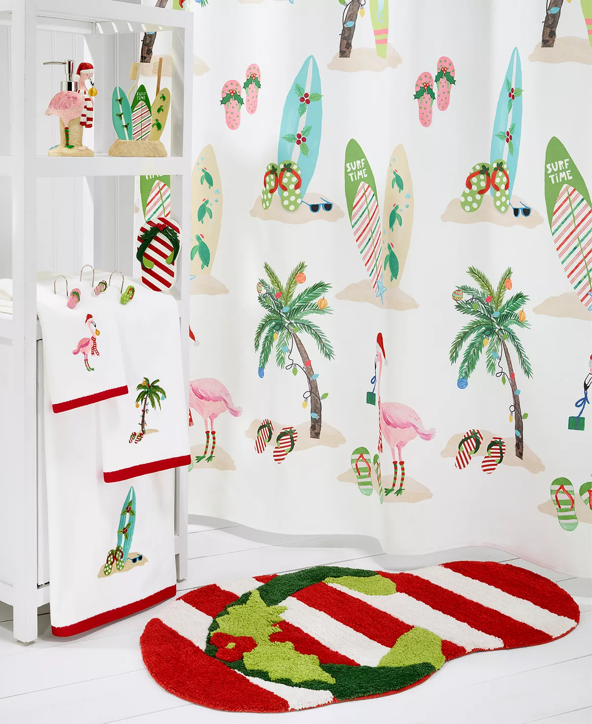 The Avanti Flamingo Jingle Bath Collection features holiday and coastal icons including flamingos, palm trees, surfboards and flip-flops in festive colors.