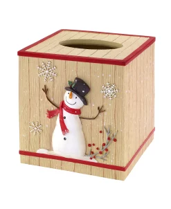 The Avanti Friends Gather tissue box cover features a happy snowman with a red scarf and top hat on a beige faux wood grain. Snowflakes and white dots surround the snowman.