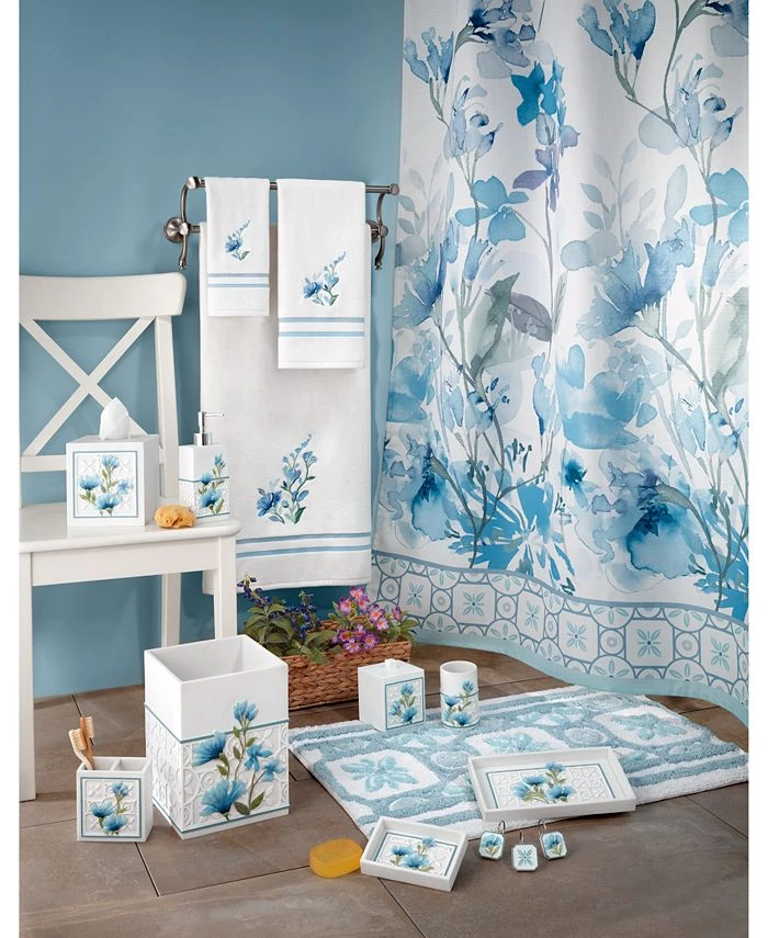 The Avanti Garden View Bath Collection features a group of spring blossoms in light and dark shades of blue with green stems in front of a trellis design. Bring the beauty of a romantic spring garden to your bathroom, artistically depicted in debossed and hand-painted resin.