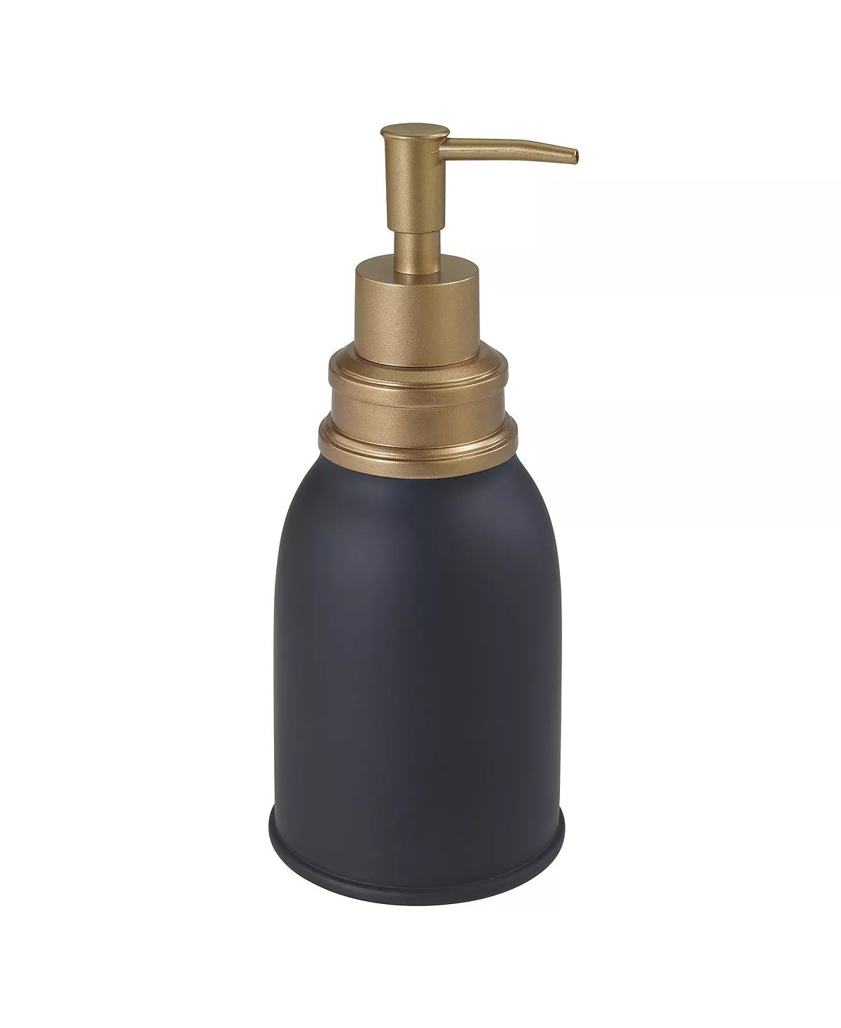 The Avanti Memphis Lotion, Soap and Sanitizer Dispenser delivers a smooth matte black finish with beveled industrial accents in vintage gold metallic. Crafted in durable resin for long life. Full coordinating bath accessory collection is available.