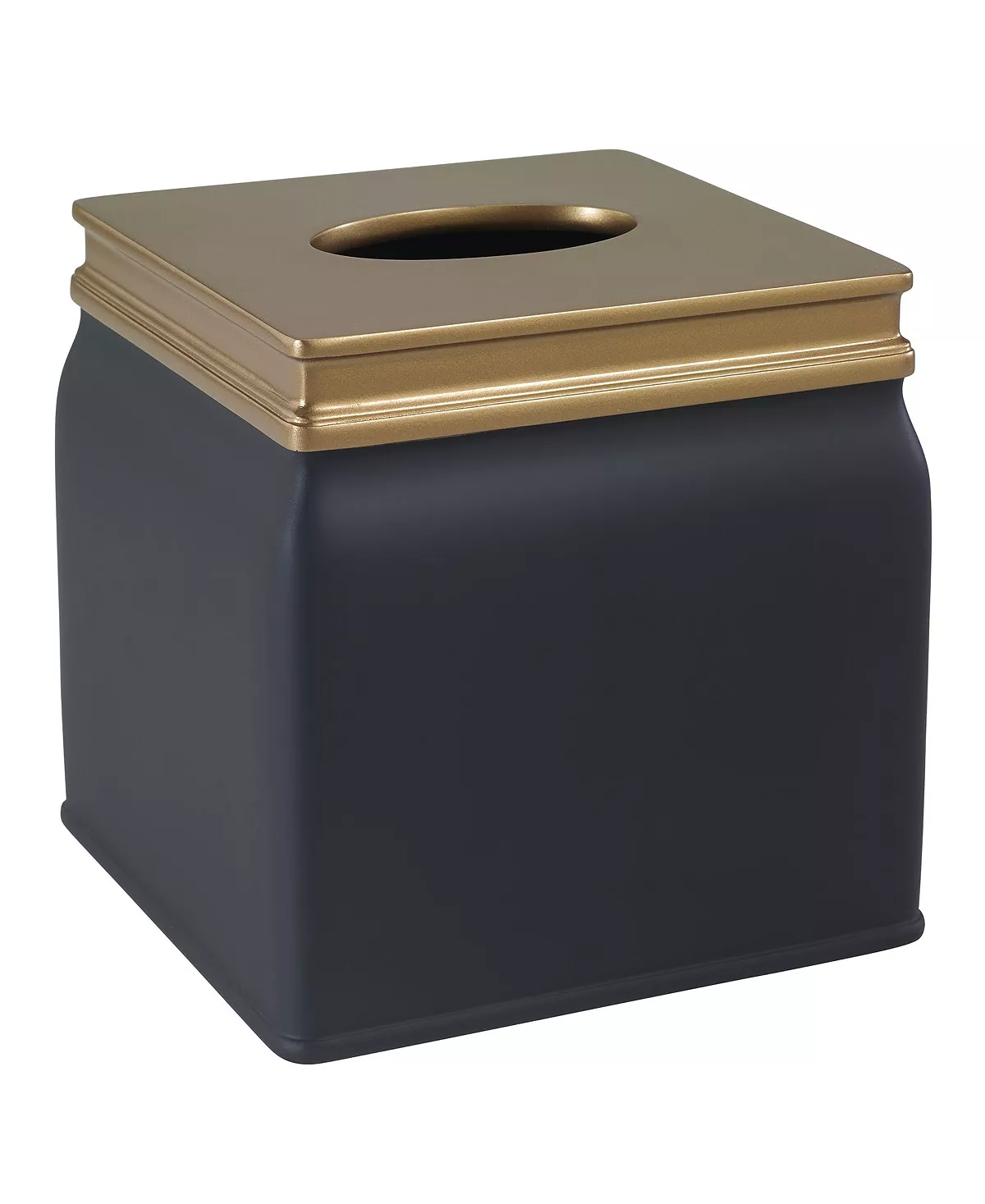 The Avanti Memphis Tissue Cover delivers a smooth matte black finish with beveled industrial accents in vintage gold metallic. Crafted in durable resin for long life. Full coordinating bath accessory collection is available.