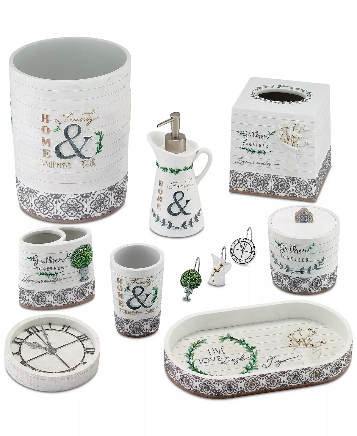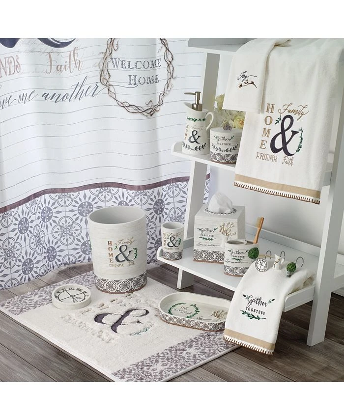 - Accessories: resin; towels: 100% cotton exclusive of embellishment; bath rug: 100% cotton; shower curtain: polyester
