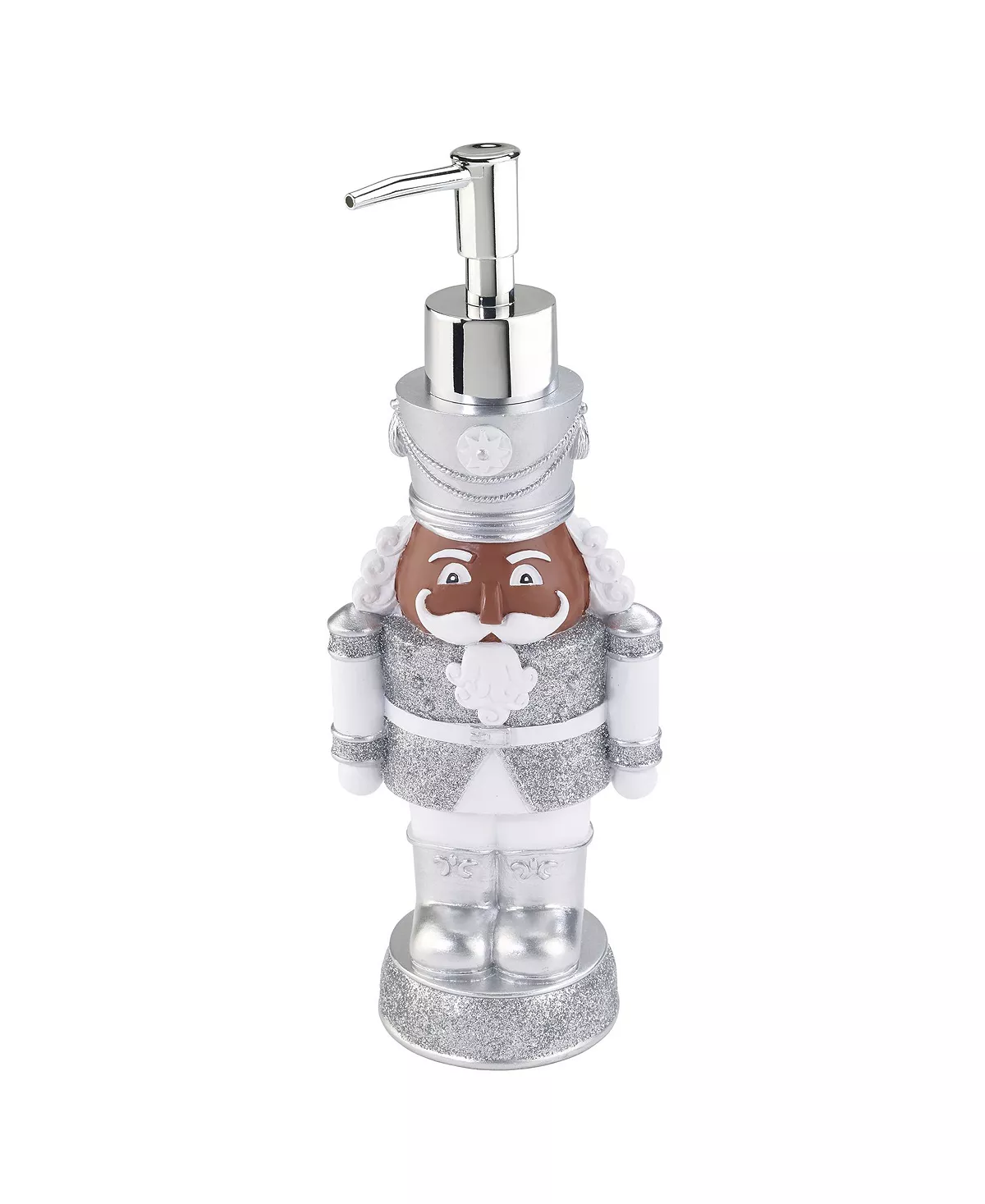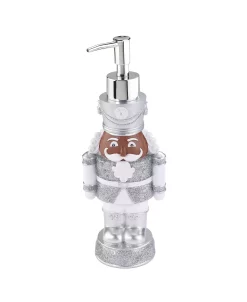 The Avanti African American Nutcracker lotion, soap, sanitizer dispenser is festively attired in a silver-tone with glitter suit and a white mustache. He has a shiny coordinating shiny silver-tone pump.