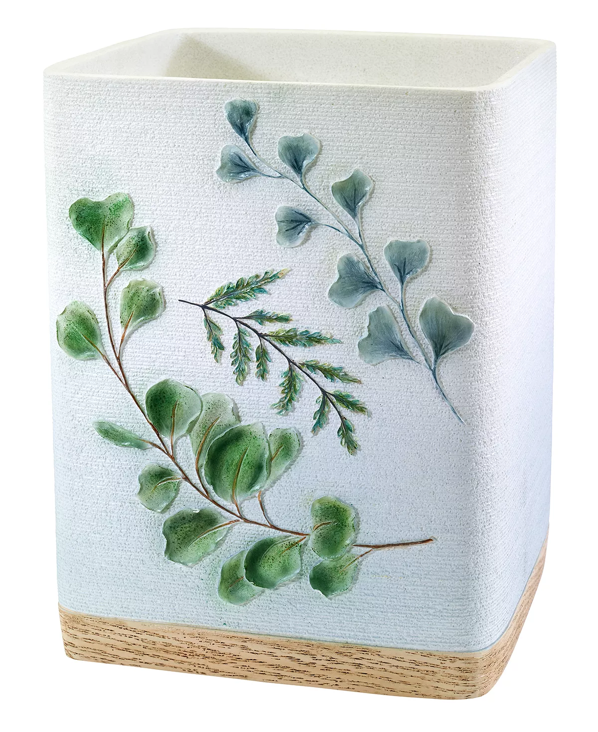 The Avanti Ombre Leaves Wastebasket is decorated with botanicals in shades of green on an ombred, textured ground. The bottom is wrapped with a coordinating light brown textured band.