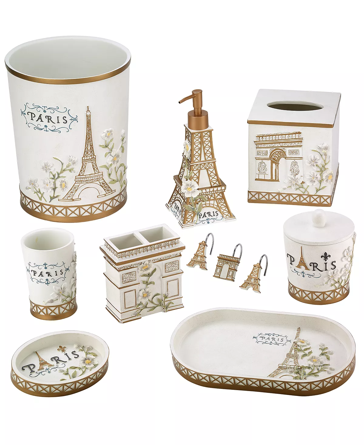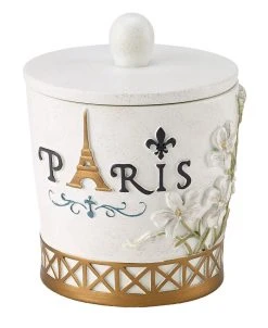 The Avanti Paris Botanique Covered Jar features “Paris” with an Eiffel Tower “A” and flowers in relief in shades of taupe and grey on an off-white base. The bottom is bordered with a gold grid pulled from the Eiffel Tower.