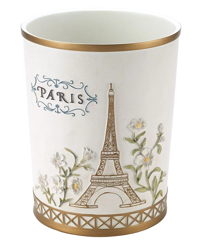The Avanti Paris Botanique Wastebasket features “Paris” in grey , the Eiffel Towel in gold and flowers in relief in neutral shades on an off-white base. The bottom is bordered with a gold grid pulled from the Eiffel Tower.