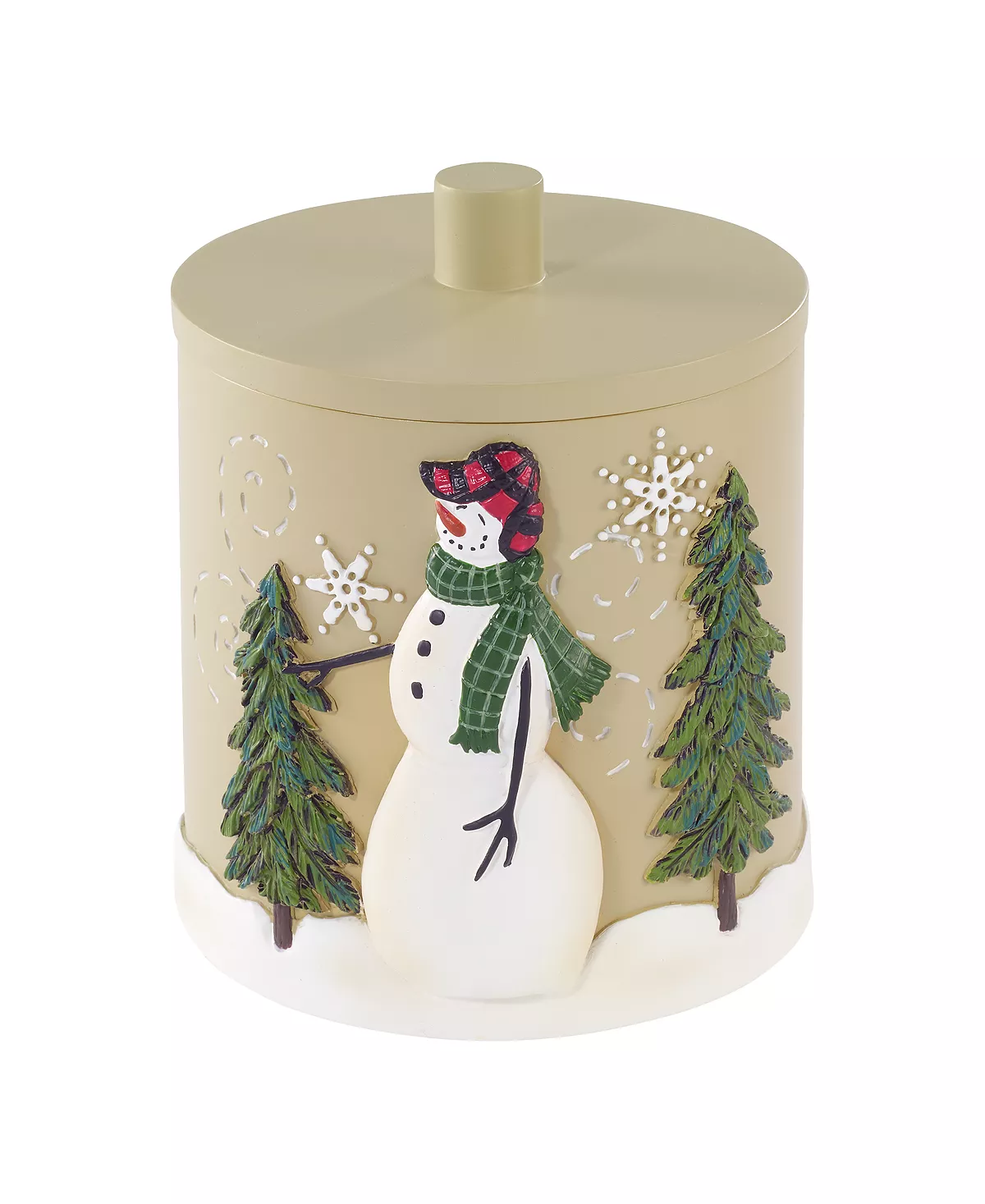The Avanti snowmen gathering decorative covered jar features a happy snowman with plaid scarf and hat with two pine trees and 2 snowflakes on a tan background. The removable cover is also tan.