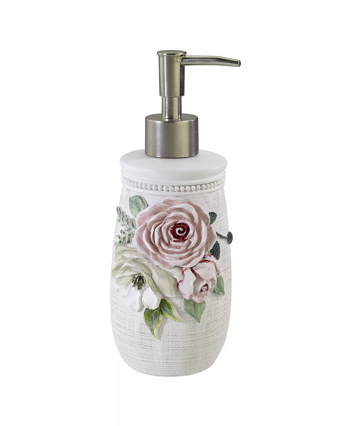 The Avanti spring garden lotion, soap and sanitizer dispenser is embossed with dimensional peonies in pink and white with green leaves on an off-white textured ground .Made of durable, hand-painted resin. Coordinating accessories, shower curtain, rug and towel also available.
