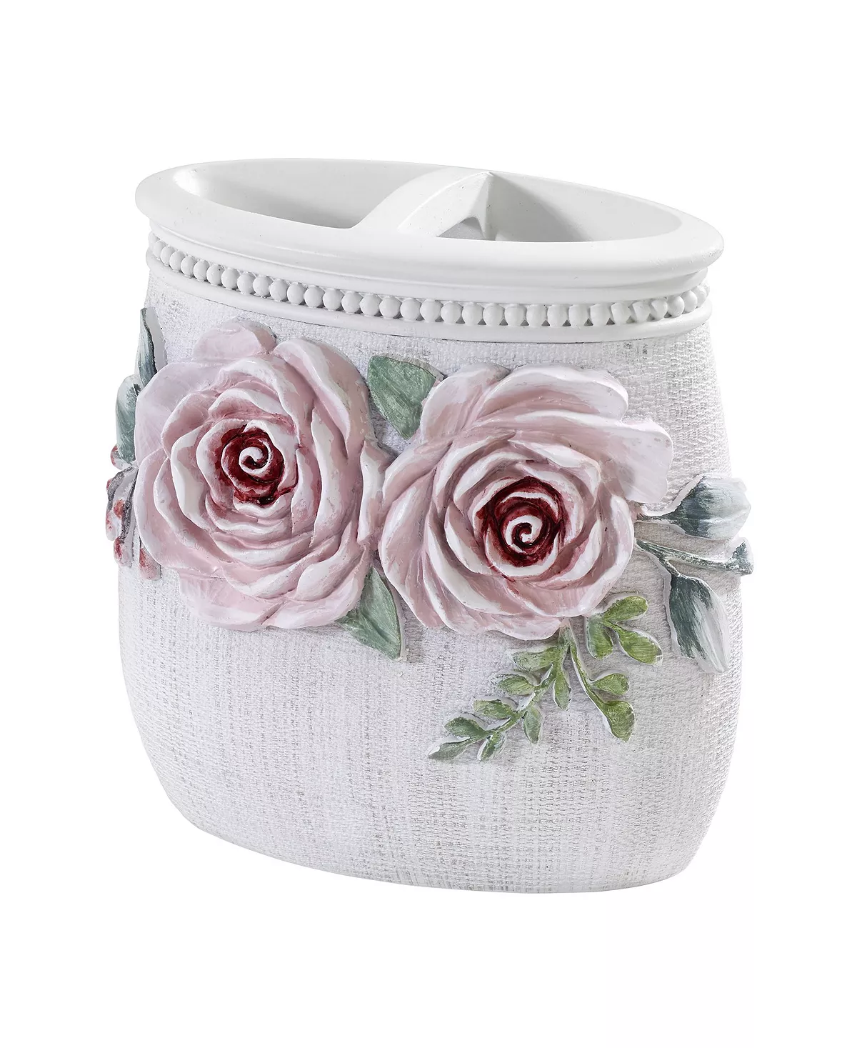 The Avanti spring garden toothbrush holder is decorated with embossed, dimensional peonies in pink and white with green leaves on an off-white textured ground and crown molding detail around the top. Made of durable, hand-painted resin. Coordinating pieces available.