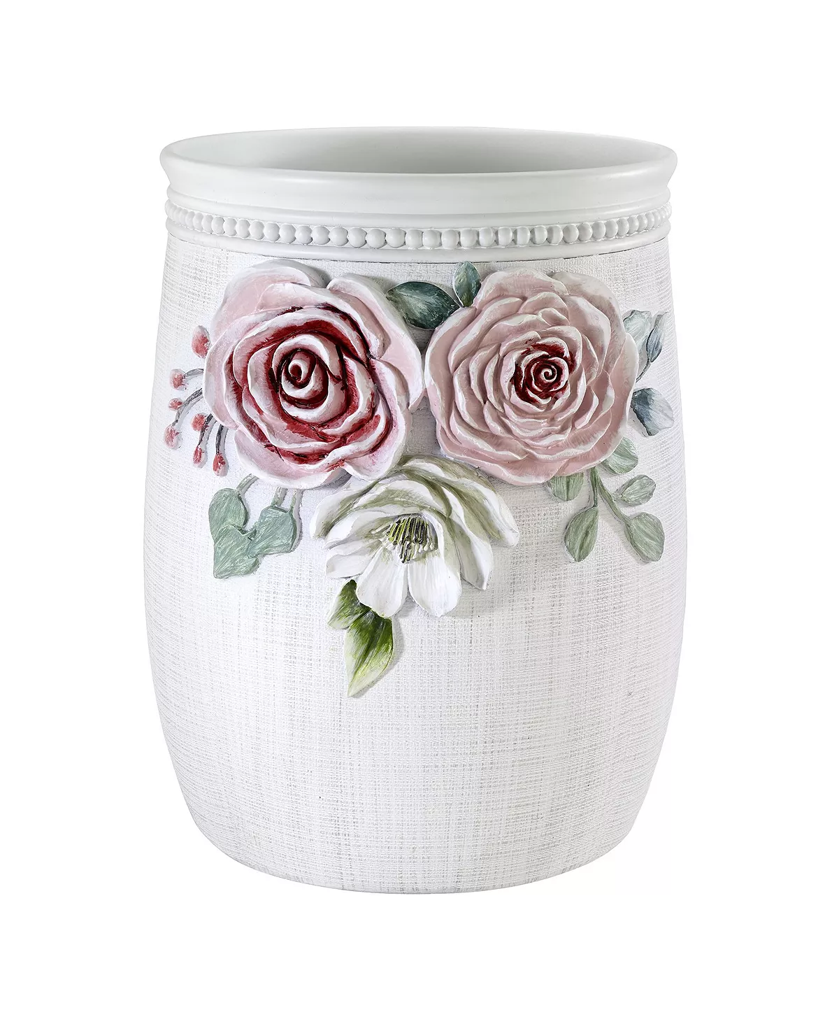 The Avanti spring garden wastebasket is embossed with dimensional peonies in pink and white with green leaves on an off-white textured ground and crown molding detail around the top. Made of durable, hand-painted resin. Coordinating pieces also available.