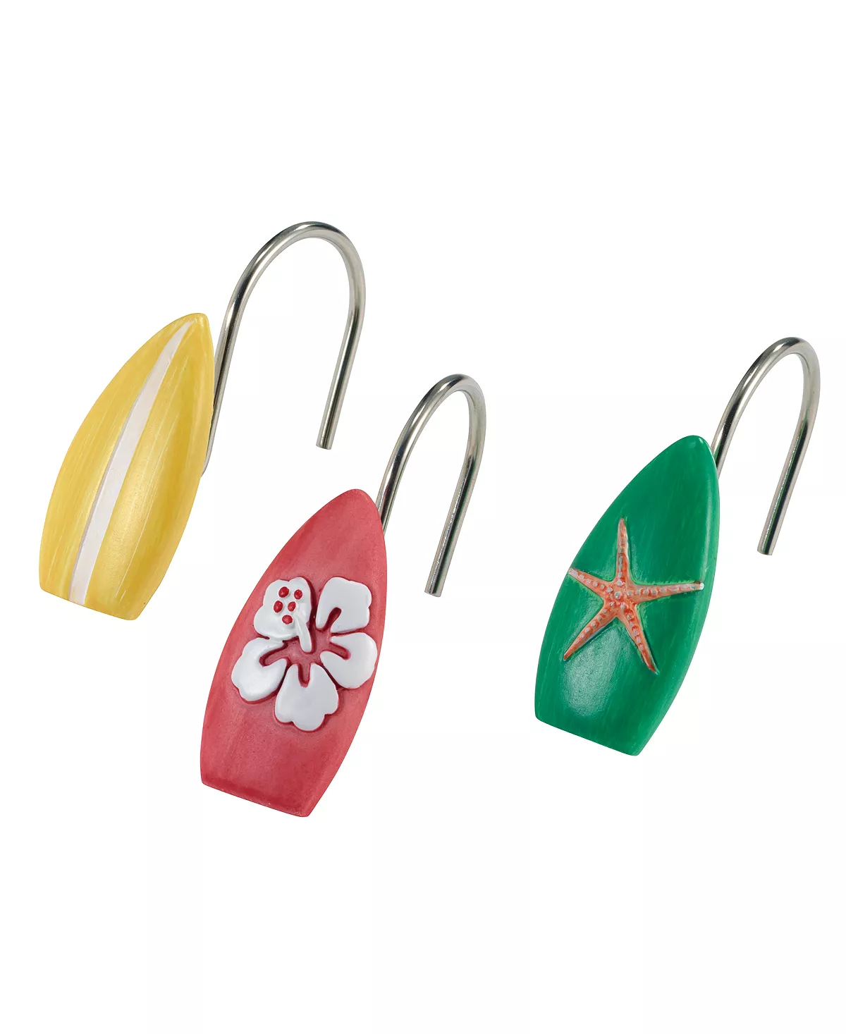 The Avanti Surf Time Shower Curtain Hooks features 3 different colorful surfboards pulled from the shower curtain-yellow with white stripe, green with coral starfish and coral with tropical flower. Made of durable, hand-painted resin for long-lasting use.
