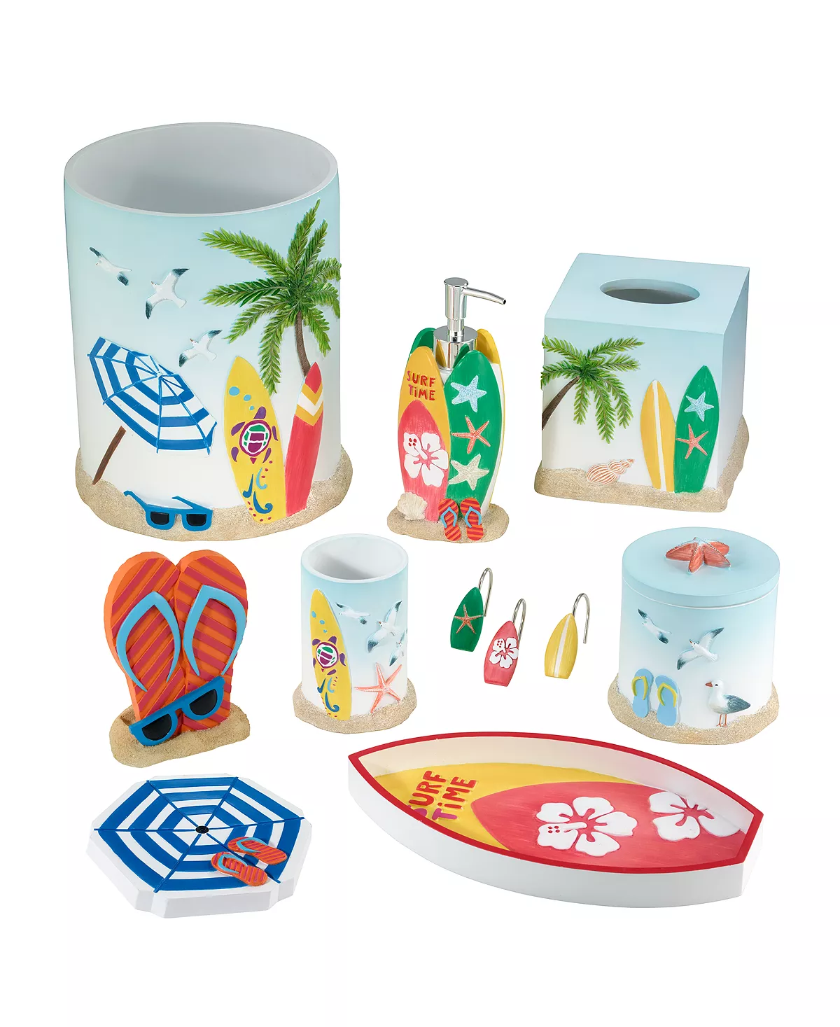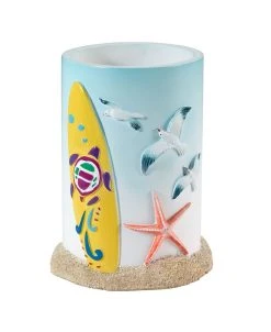 The Avanti Surf Time Tumbler features an ombred white-to-sky blue ground with dimensional seagulls, a yellow surfboard and coral-colored starfish. The base is crafted to look like sand. Made of durable, hand-painted resin.