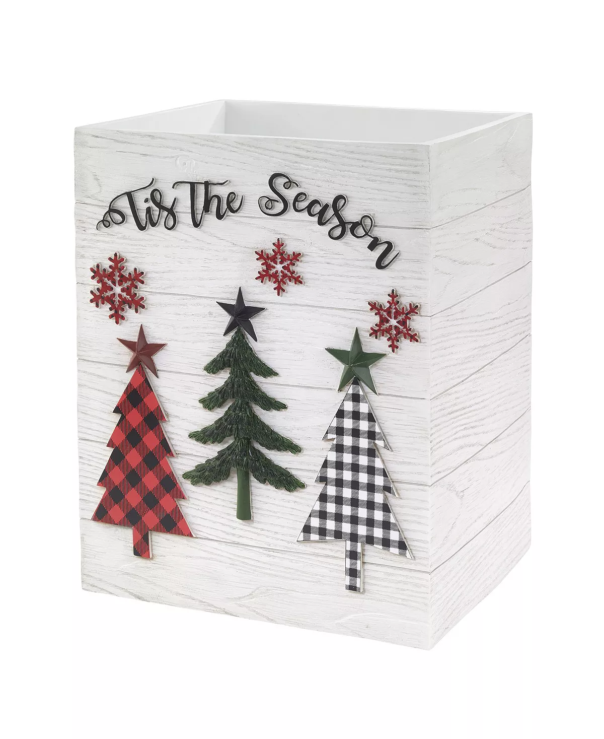 The Avanti Tis the Season wastebasket features dimensional white, green and red plaid Christmas trees with red stars on an off-white and beige woodgrain ground. “Tis the Season” across the top finishes the look.