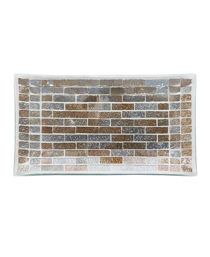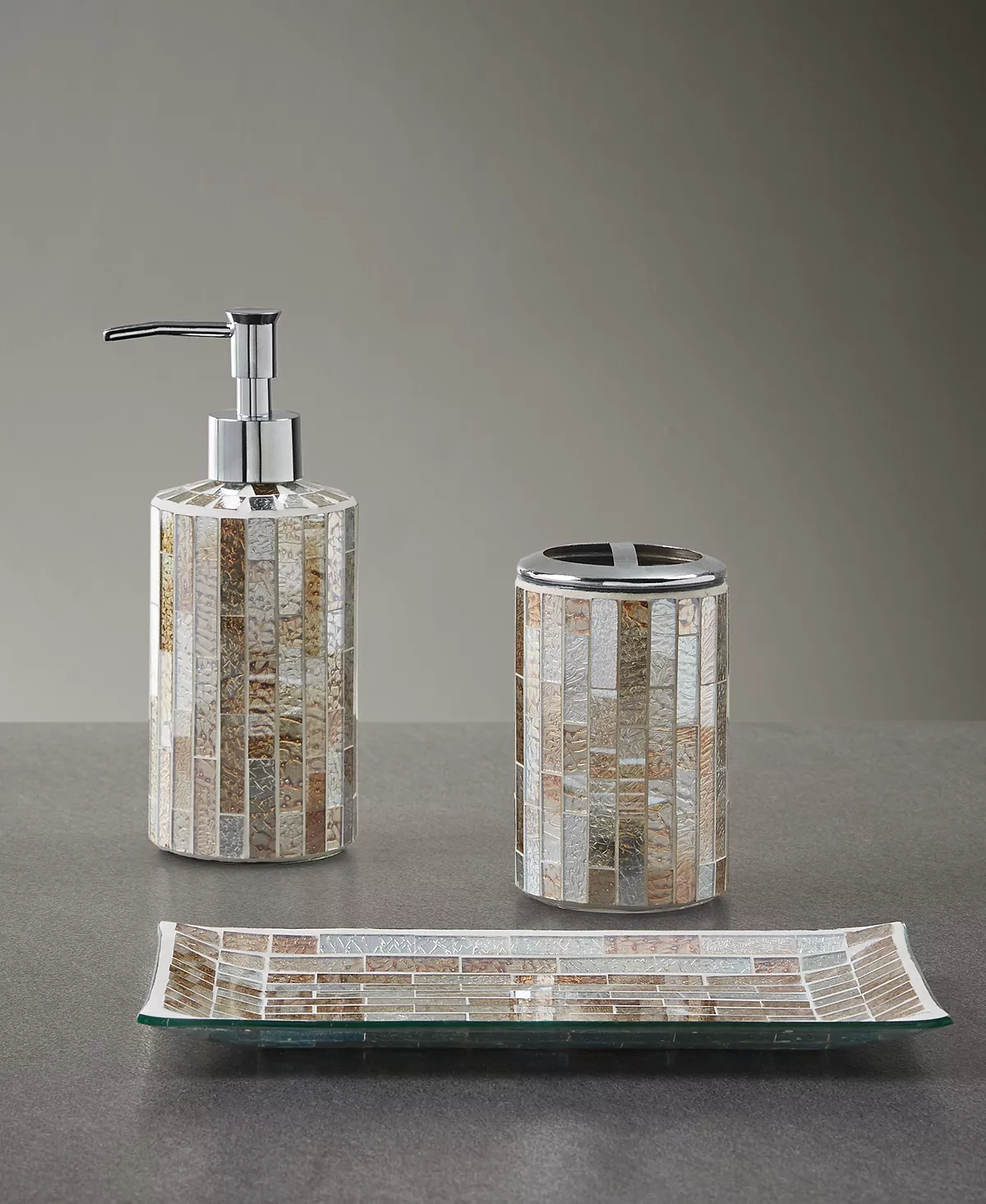 Add instant luxury to your bathroom with our Décor Studio Charolette mosaic 3pc Bath accessory set. The set features beautiful mosaic glass in shades neutral shades of gold and silver. Set includes 1 Lotion Pump, 1 Toothbrush holder and 1 Vanity Tray