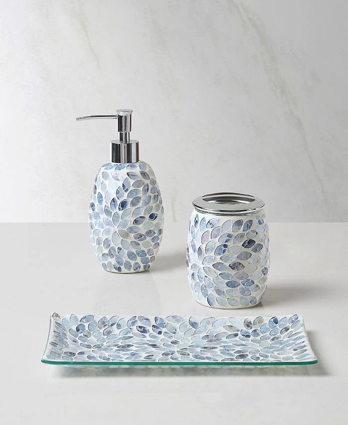 Light up your bathroom’s look with the sparkling mosaic glass design of these Gwen bath accessories from Décor Studio. Set includes a vanity tray, toothbrush holder and soap dispenser. Makes a great gift!