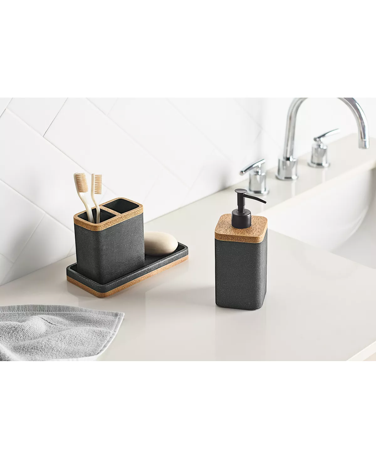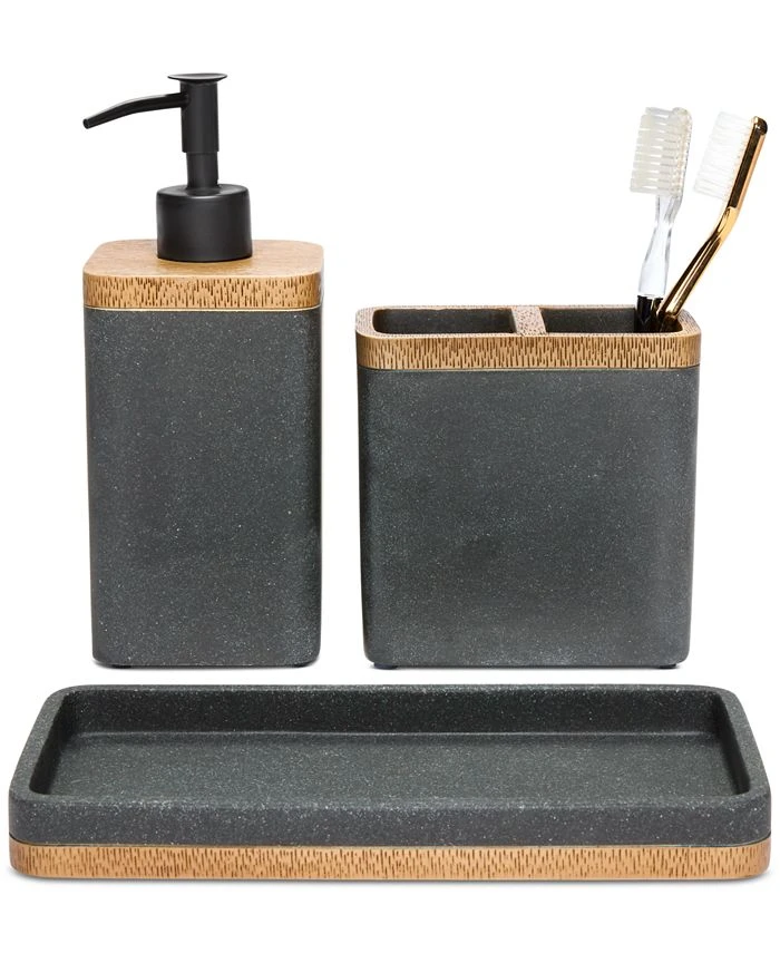 Dress up your bathroom with this 3 piece bathroom accessory set from Hotel collection, crafted in faux wood resin. This set features a soap pump, toothbrush holder and tray.