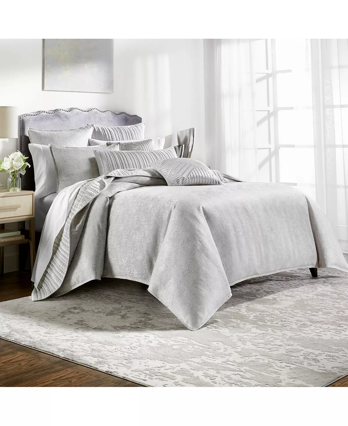 Transform your bedroom with Hotel Collection’s Tessellate Bedding collection, featuring a richly textured jacquard design with metallic sheen done in beautiful tones of silver.