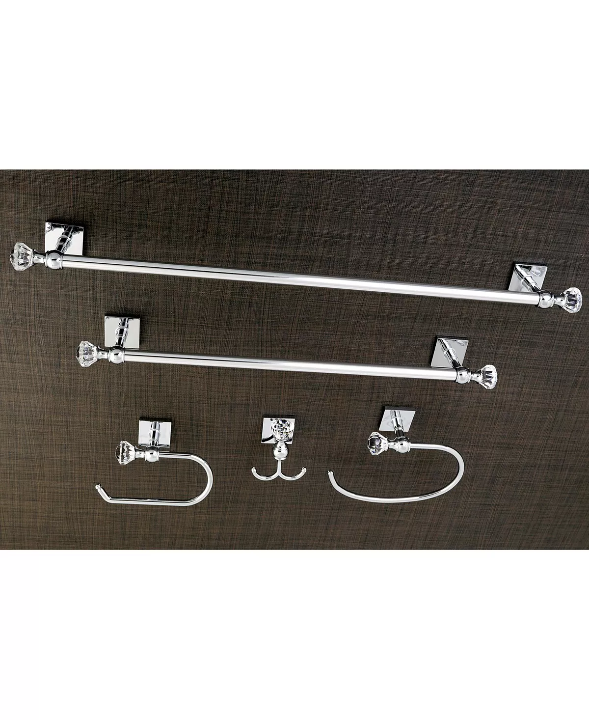 This all inclusive set of bathroom accessories features intricate detailing for a luxurious and astonishing style. Two towel bars, towel ring, robe hook, and a toilet paper holder are included for all of your hanging storage needs.