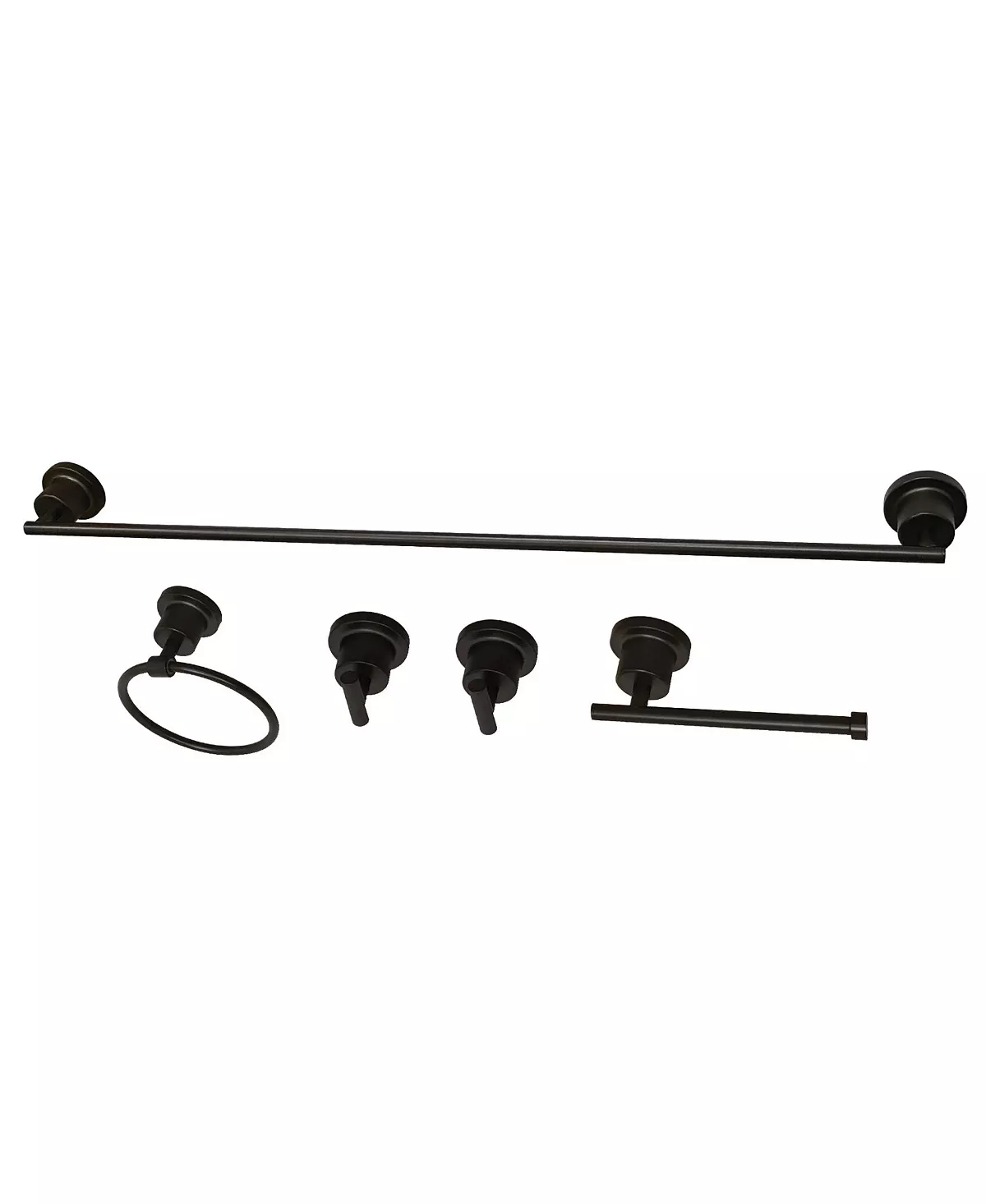 - Set includes 30-inch towel bar, towel ring, toilet paper holder and 2 robe hooks