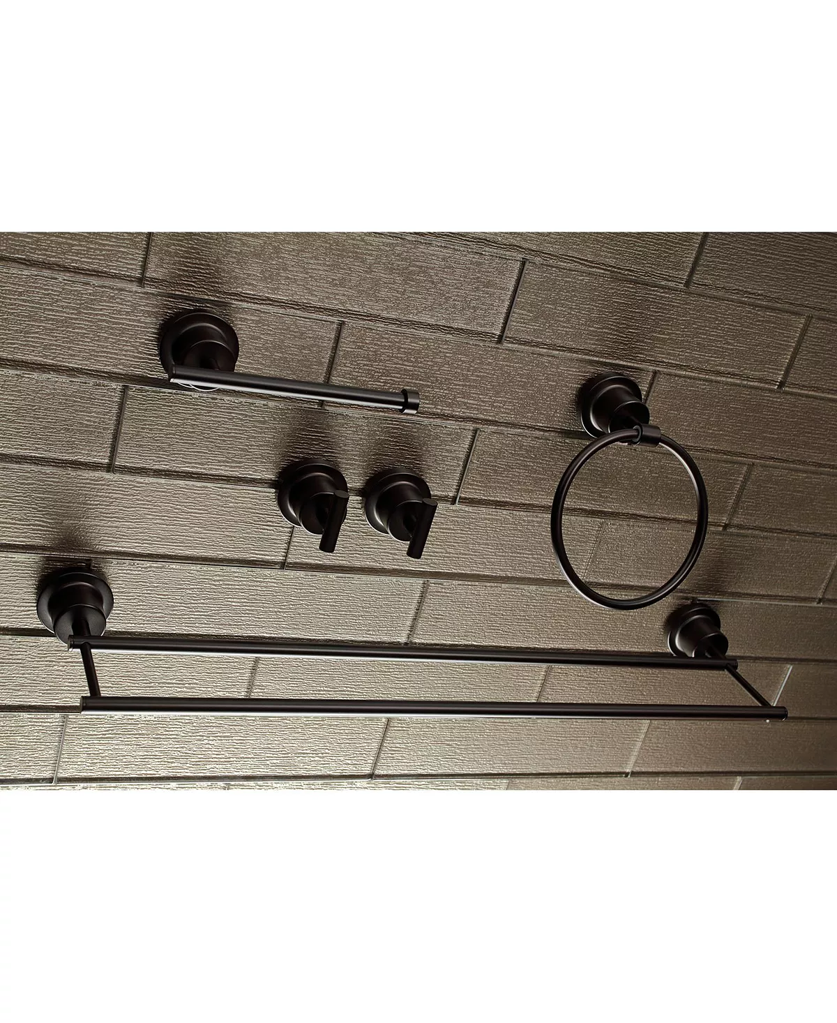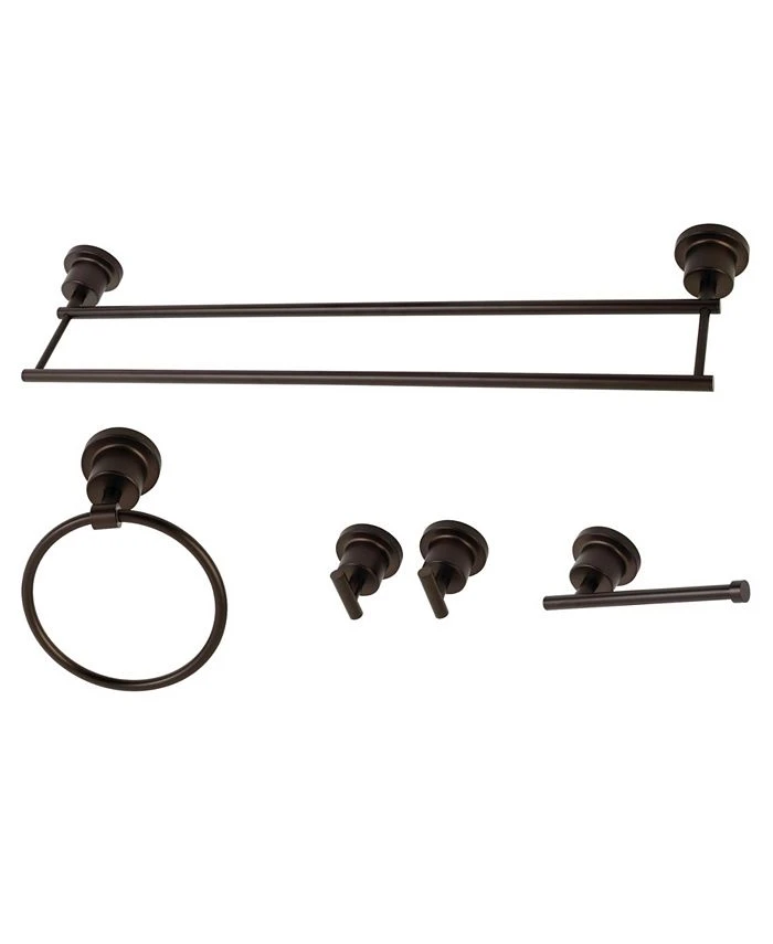 This all inclusive set of bathroom accessories features intricate detailing for a luxurious and astonishing style. One dual towel bar, towel ring, two robe hooks, and a toilet paper holder are included for all of your hanging storage needs.