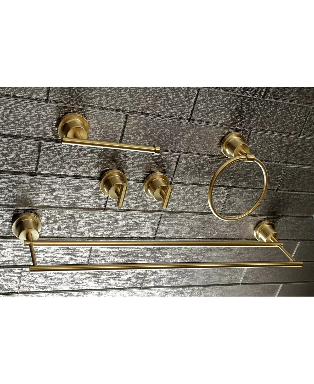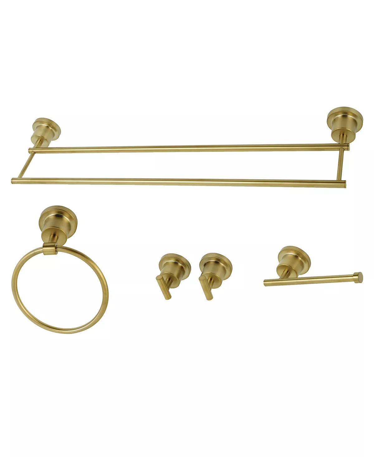 - Includes 24″ Double Towel Bar, Towel Ring, Robe Hooks, Toilet Paper Holder