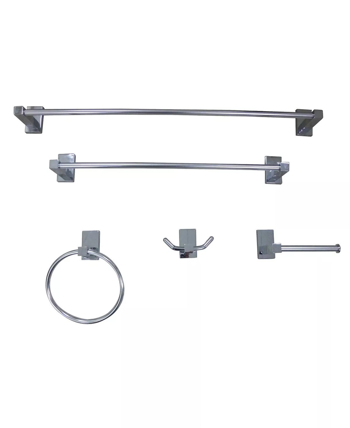 - Set Includes 1 each: 24″ Towel Bar, 18″ Towel Bar, Towel Ring, Robe Hook and Toilet Paper Holder