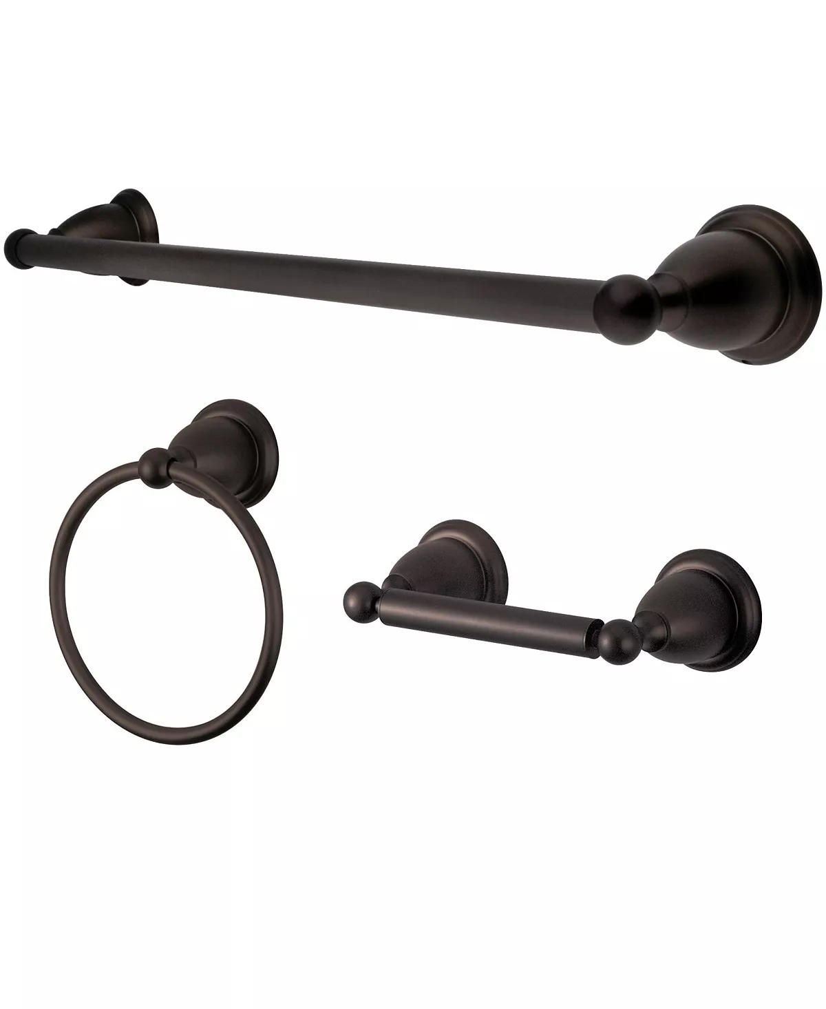 - Includes: 18″ Towel Bar, Towel Ring, Toilet Paper Holder