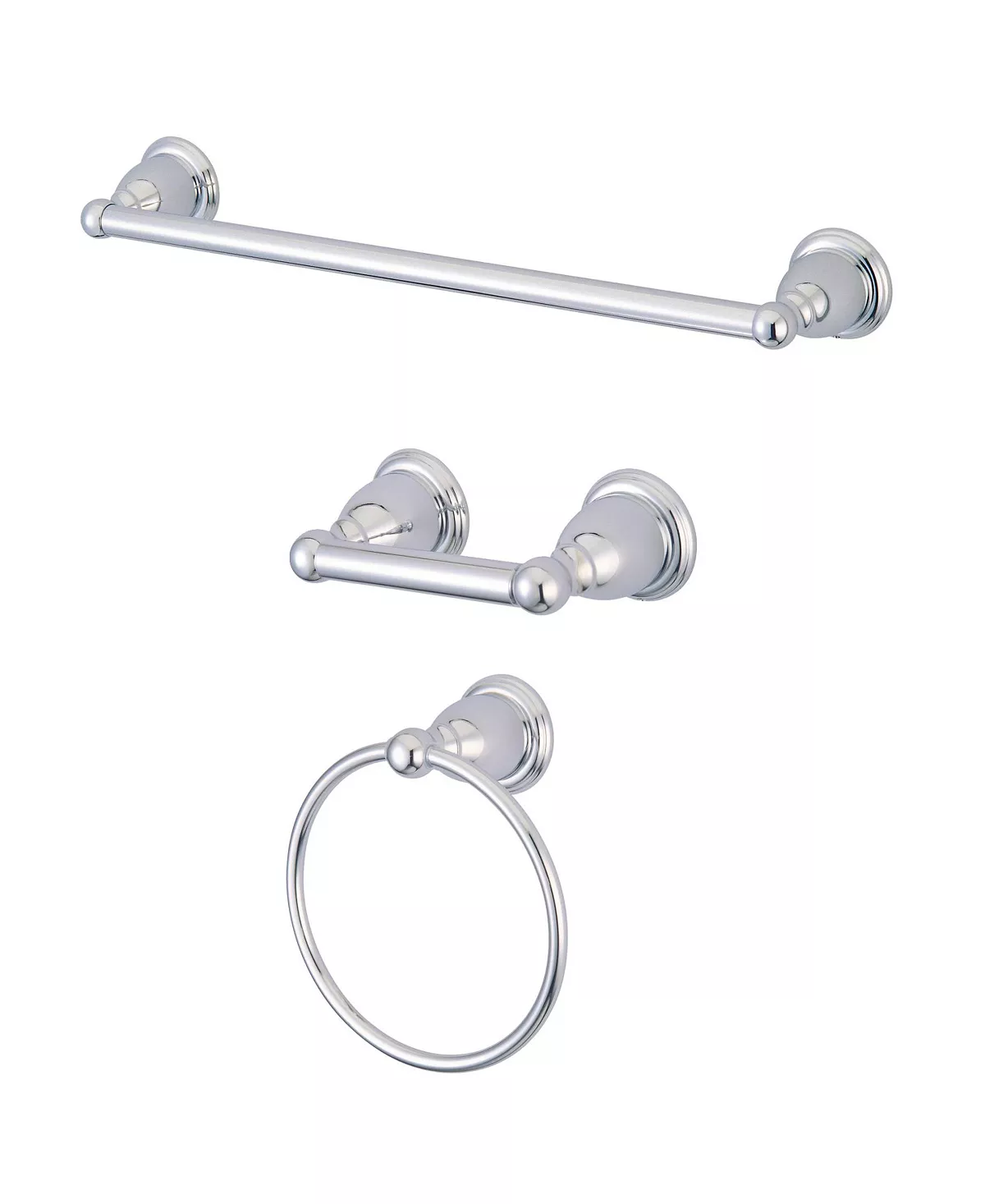 - Includes: 18″ Towel Bar, Towel Ring, Toilet Paper Holder