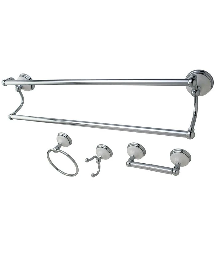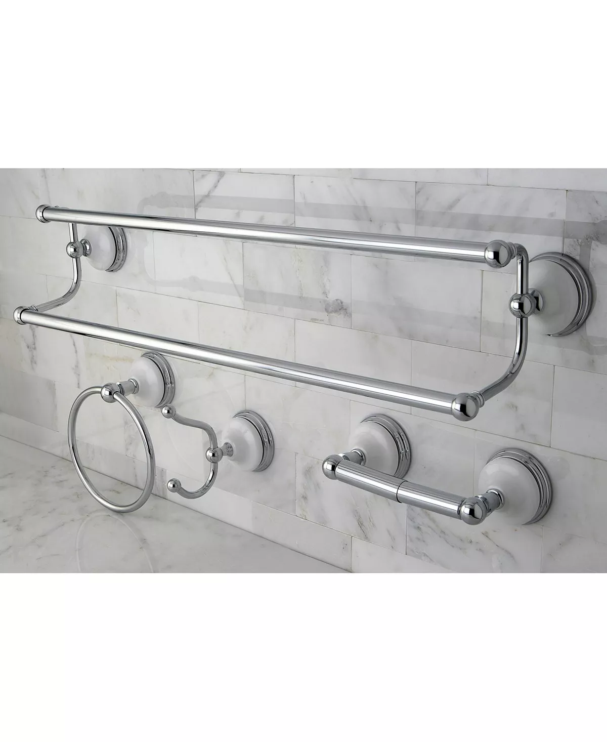 This all inclusive set of bathroom accessories features intricate detailing for a luxurious and astonishing style. One dual towel bar, towel ring, robe hook, and a toilet paper holder are included for all of your hanging storage needs.
