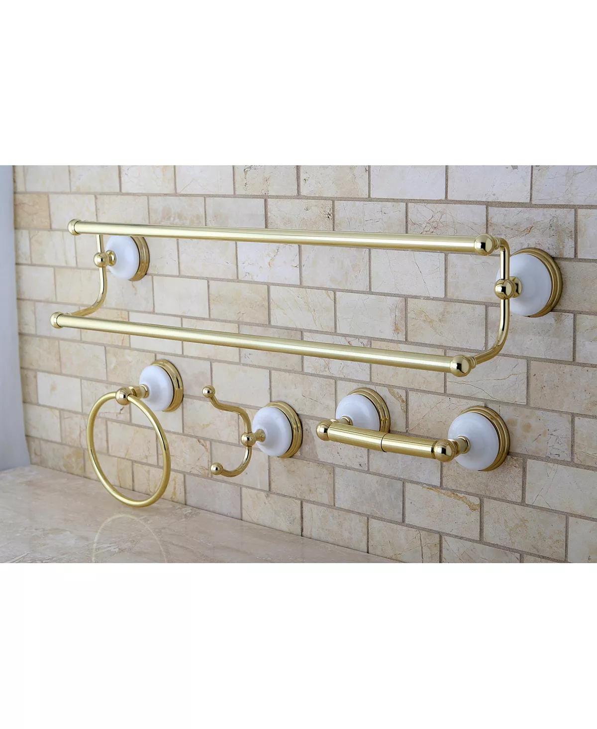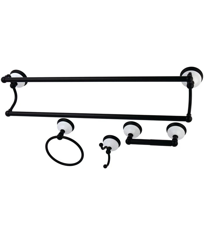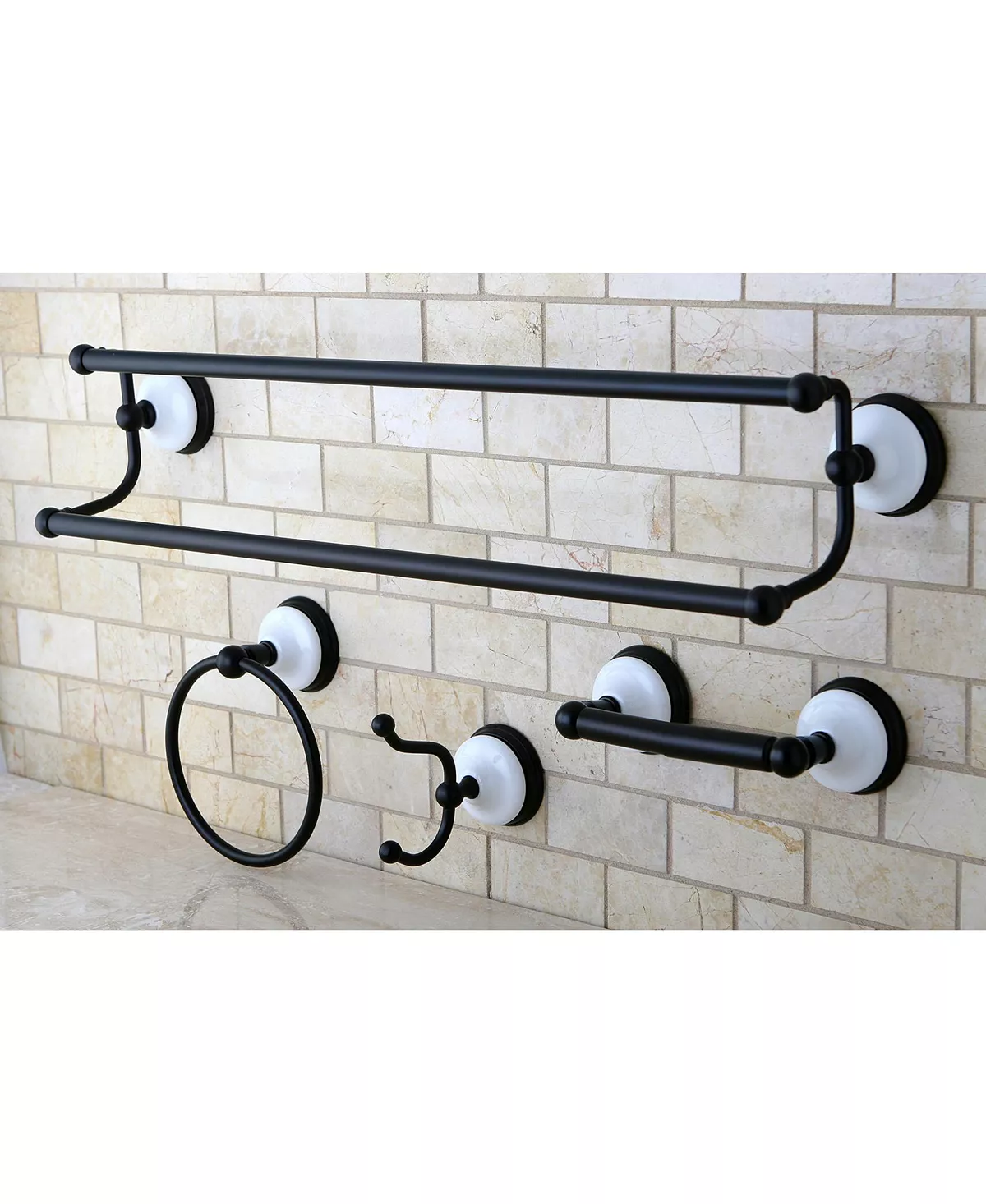 This all inclusive set of bathroom accessories features intricate detailing for a luxurious and astonishing style. One dual towel bar, towel ring, robe hook, and a toilet paper holder are included for all of your hanging storage needs.