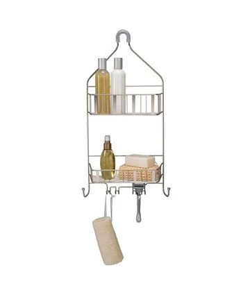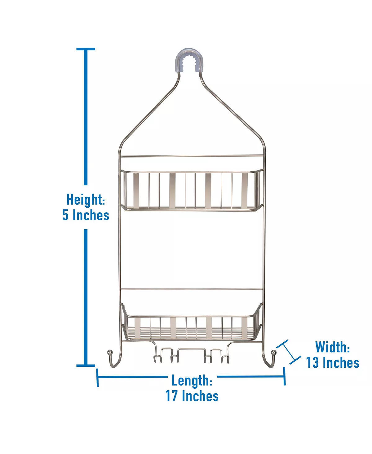 Keep your shower organized with the Laura Ashley shower caddy. Features 1 deep and 1 shallow basket for multiple storage options. Complete with 2 hanging hooks for washcloths and 4 built in hooks for razors and toothbrushes.